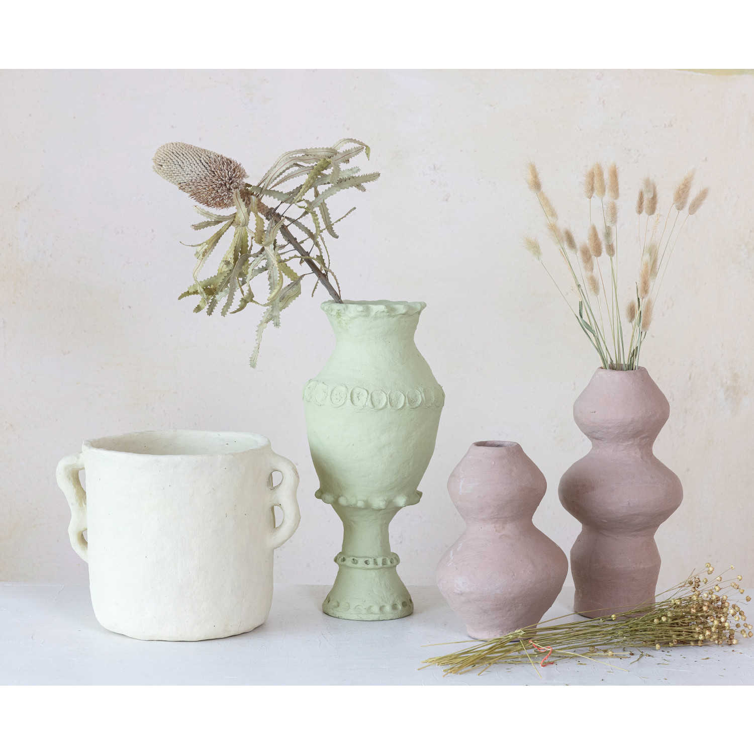 This handmade paper mâché vase, featuring a mint color and embossed and debossed design, is a creative and beautiful home accessory. Made from paper pulp and glue, it has a round shape with a wide opening and a textured, dimensional effect. The mint color adds a fresh and soothing look. This vase can be used as a decorative accent or to hold flowers, plants, or branches. It can be placed in any room, from the living room to the bedroom, creating a cozy and stylish atmosphere. Ideal for farmhouse, French country, boho, global, or modern styles, it adds color and charm to any space. This vase is a wonderful gift for those who love art and nature. Each vase will vary slightly in color and pattern due to the handmade process.