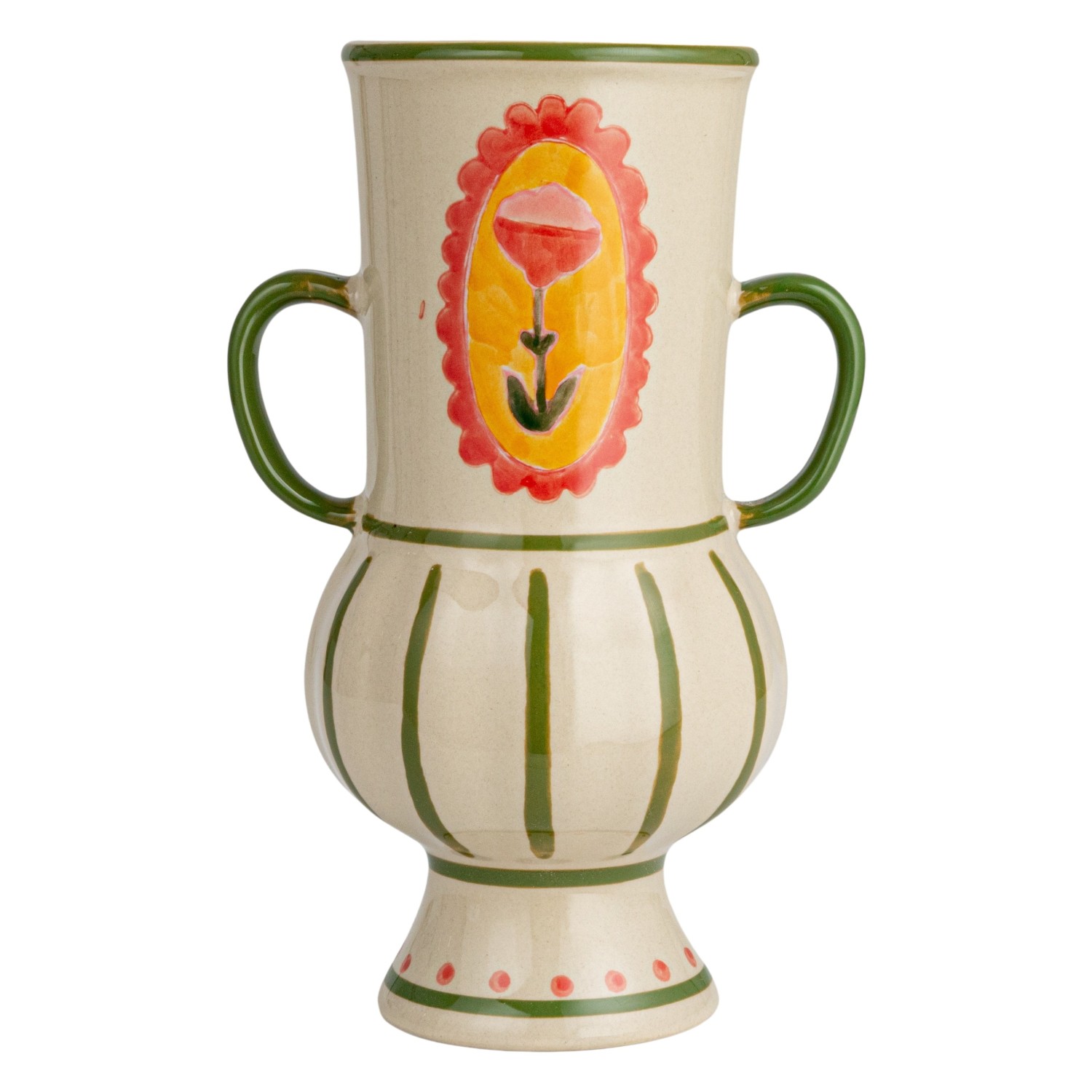 Catalog Name: 5-1/4"L x 4"W x 8"H Hand-Painted Stoneware Vase w/ Flower Image, Stripes & Handles, Multi Color ©