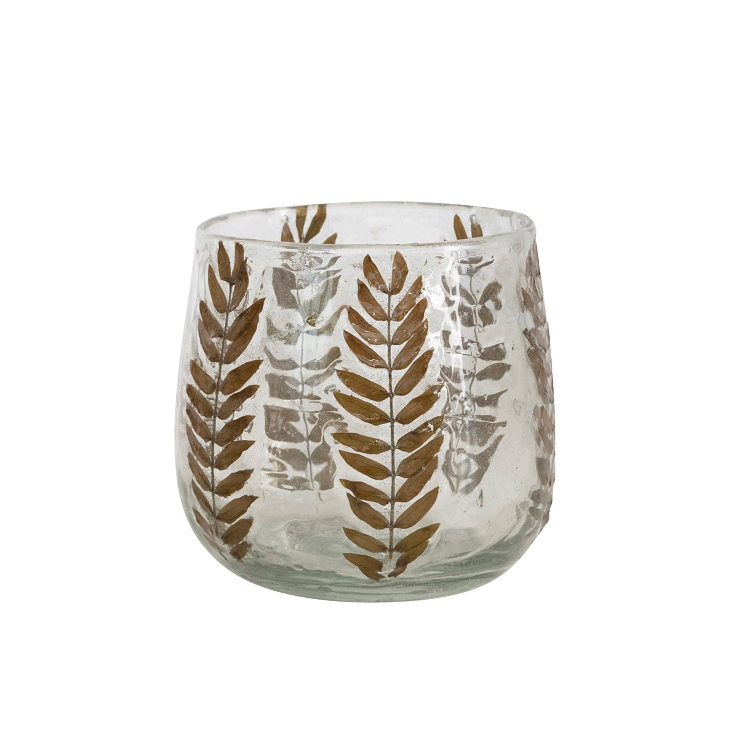 2-3/4" Round x 3"H Hand-Blown Glass Votive Holder with Embedded Natural Botanical