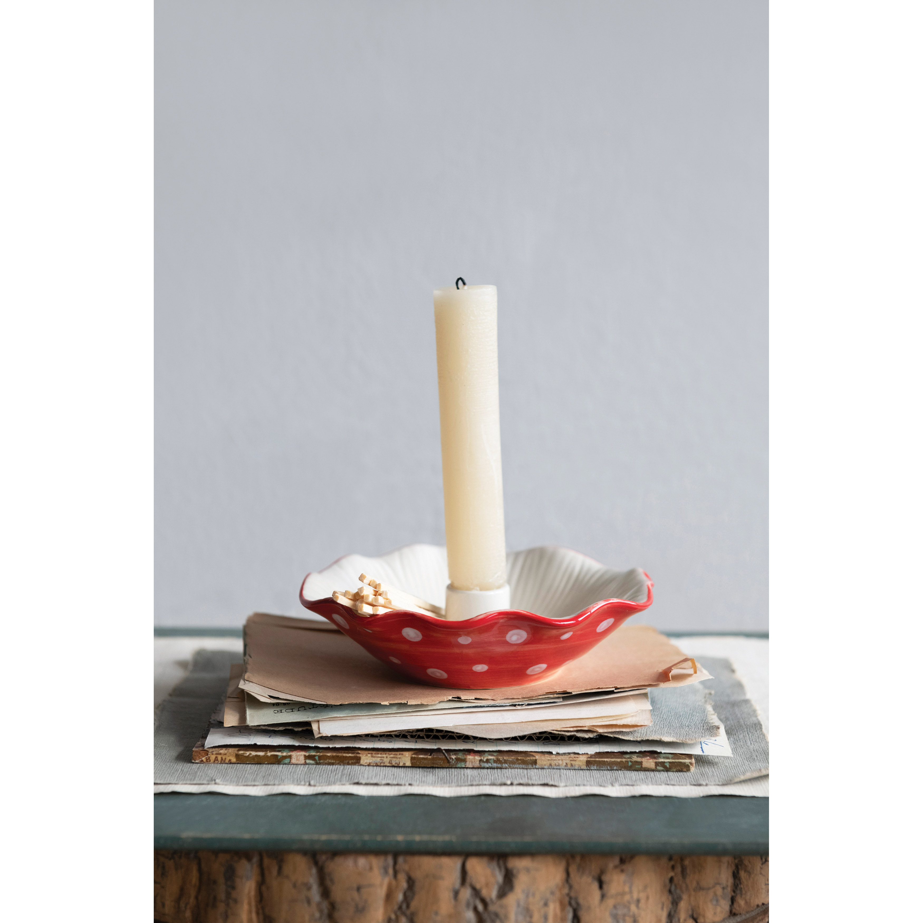 Catalog Name: 5-1/2" Round x 1-1/2"H Hand-Painted Stoneware Mushroom Taper Holder, Red and Cream Color