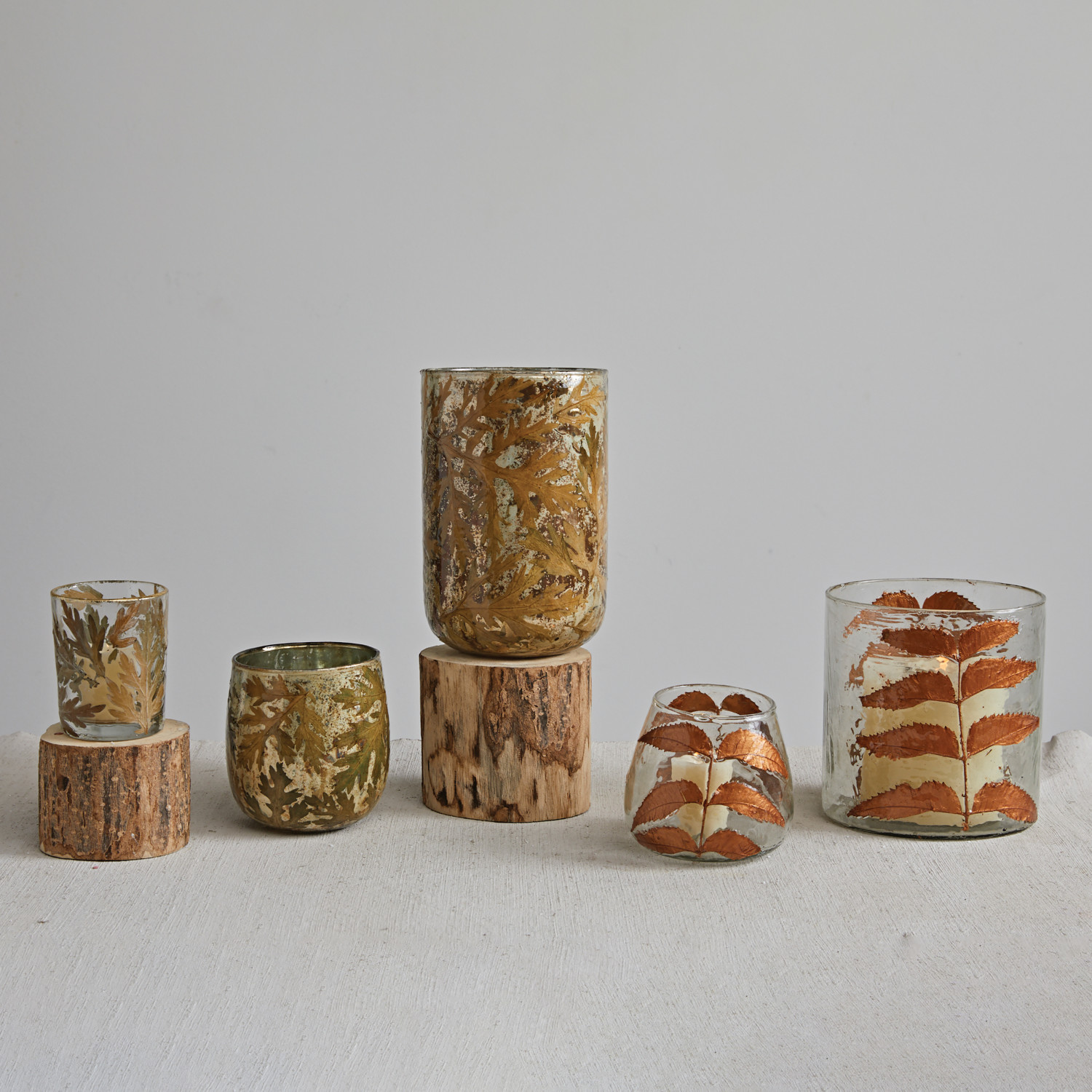 Catalog Name: 4" Round x 4"H Glass Votive Holder w/ Embedded Natural Neem Leaves, Copper Finish
