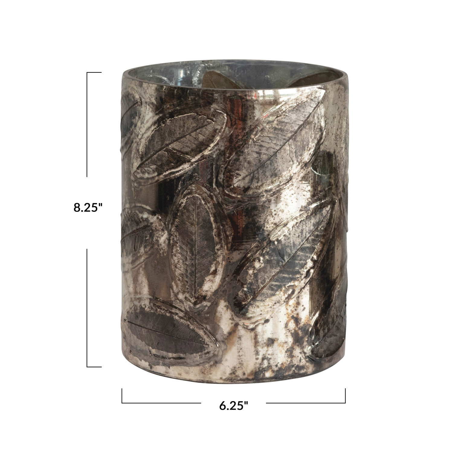 Catalog Name: 6-1/4" Round x 8-1/4"H Embossed Mercury Glass Candle Holder w/ Leaves, Oxidized Silver Finish