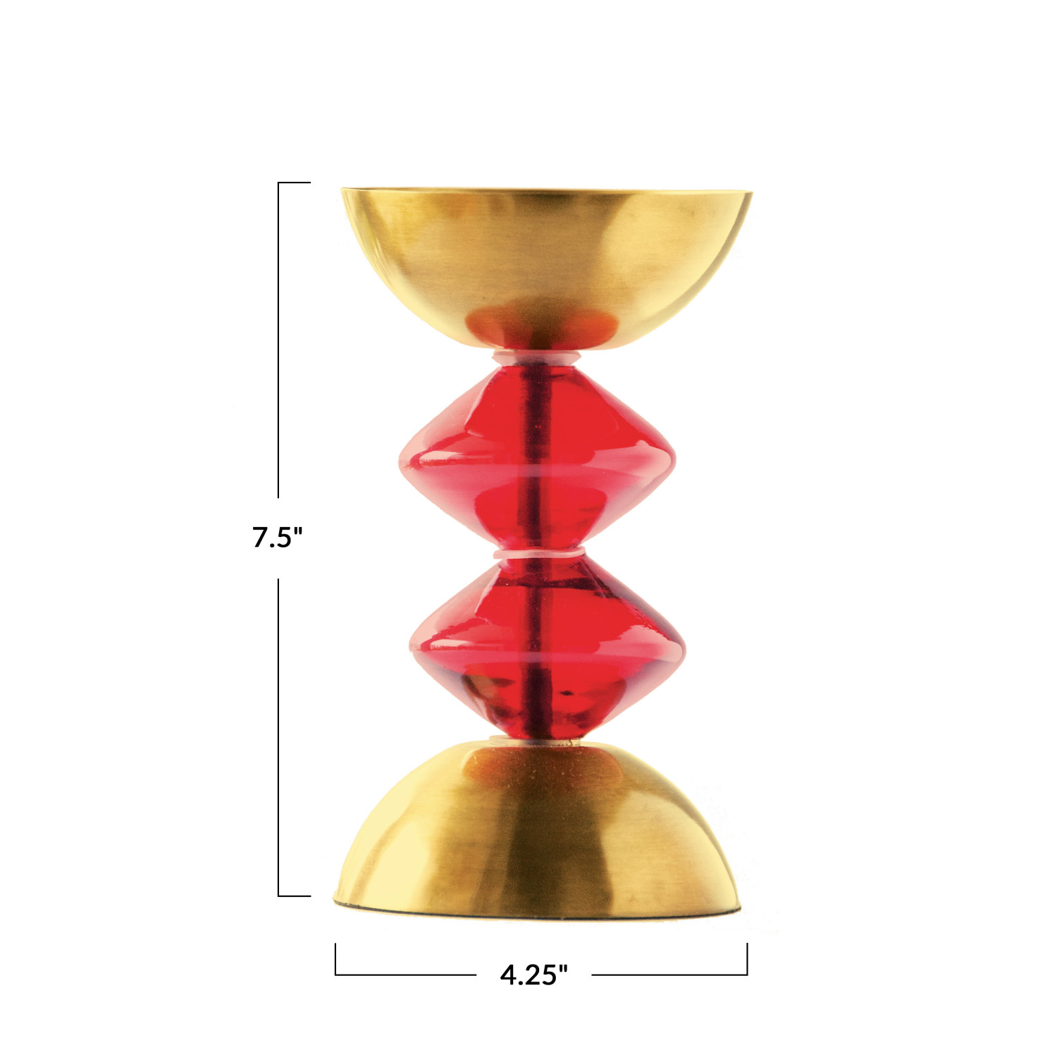 This glass and metal pillar holder is a testament to classic elegance with a modern twist. The rich red glass coupled with the antique gold finish creates a warm, inviting glow, perfect for intimate gatherings or as a luxurious addition to any home decor. Its round base and 7.5 inch height make it an ideal fit for 4-inch pillar candles, providing a stable and stylish platform that enhances the candle's natural beauty. Whether placed on a dining table as a centerpiece or on a sideboard as an accent piece, this pillar holder adds a touch of regal charm to any setting. A compact piece that captures the eye with its red glass and antique gold metal finish. A statement of elegance, this holder is a perfect centerpiece for mantels or festive tables. Ideal for indoor ambiance or as a dignified outdoor beacon on balmy evenings.