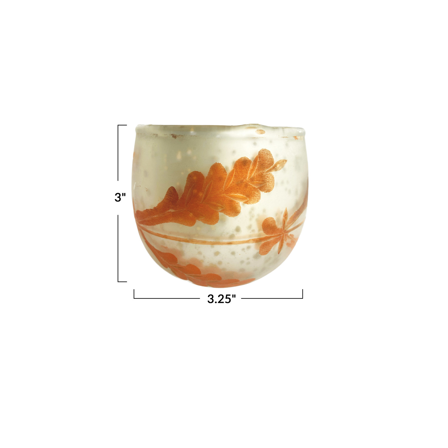 Catalog Name: 3-1/4" Round x 3"H Etched Recycled Mercury Glass Tealight/Votive Holder, Matte Silver Finish & Coral Color