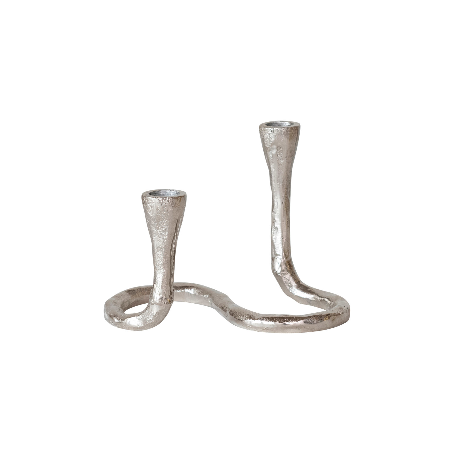 This electroplated aluminum wavy taper candleholder is a fusion of art and function. Measuring 7 inches both in length and width, and standing 6 inches tall, it is designed to hold two taper candles. The nickel finish provides a mirror-like sheen that reflects the candlelight beautifully, enhancing the ambiance of any room. The unique wavy design adds a touch of modern elegance to any decor, making it a versatile piece for both everyday use and special occasions. Its sturdy construction ensures stability while adding a sophisticated touch to the home decor. Its wavy form is not only visually striking but also adds a dynamic presence to any living space. A sleek electroplated aluminum taper candleholder with a wavy design and a lustrous nickel finish. An embodiment of modern elegance, this piece adds a sophisticated twist to any decor. Ideal for creating a focal point on dining tables or sideboards, it holds 2 tapers for a balanced glow.