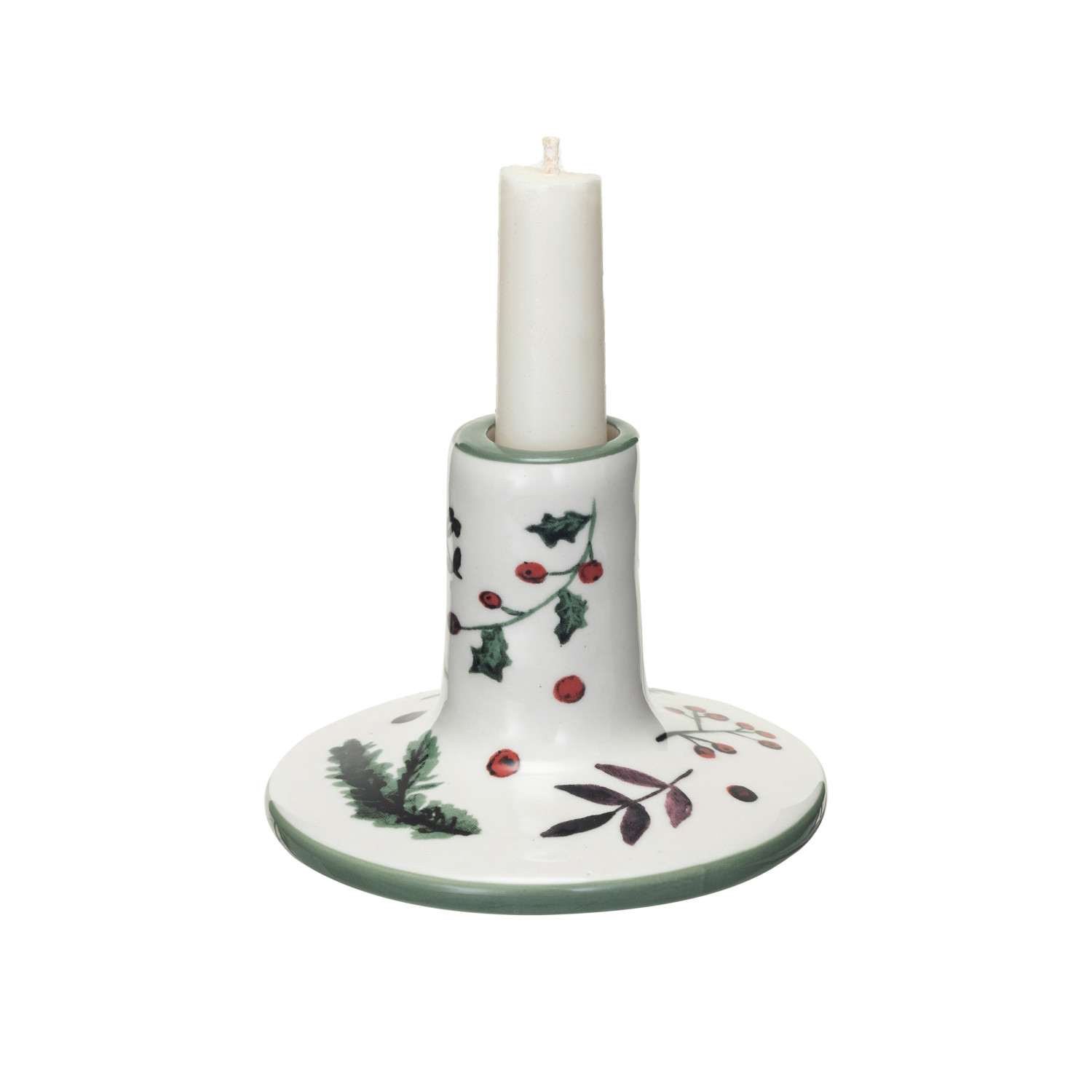 Hand-Painted Stoneware Taper Holder w/ Seasonal Botanicals, White, Red & Green