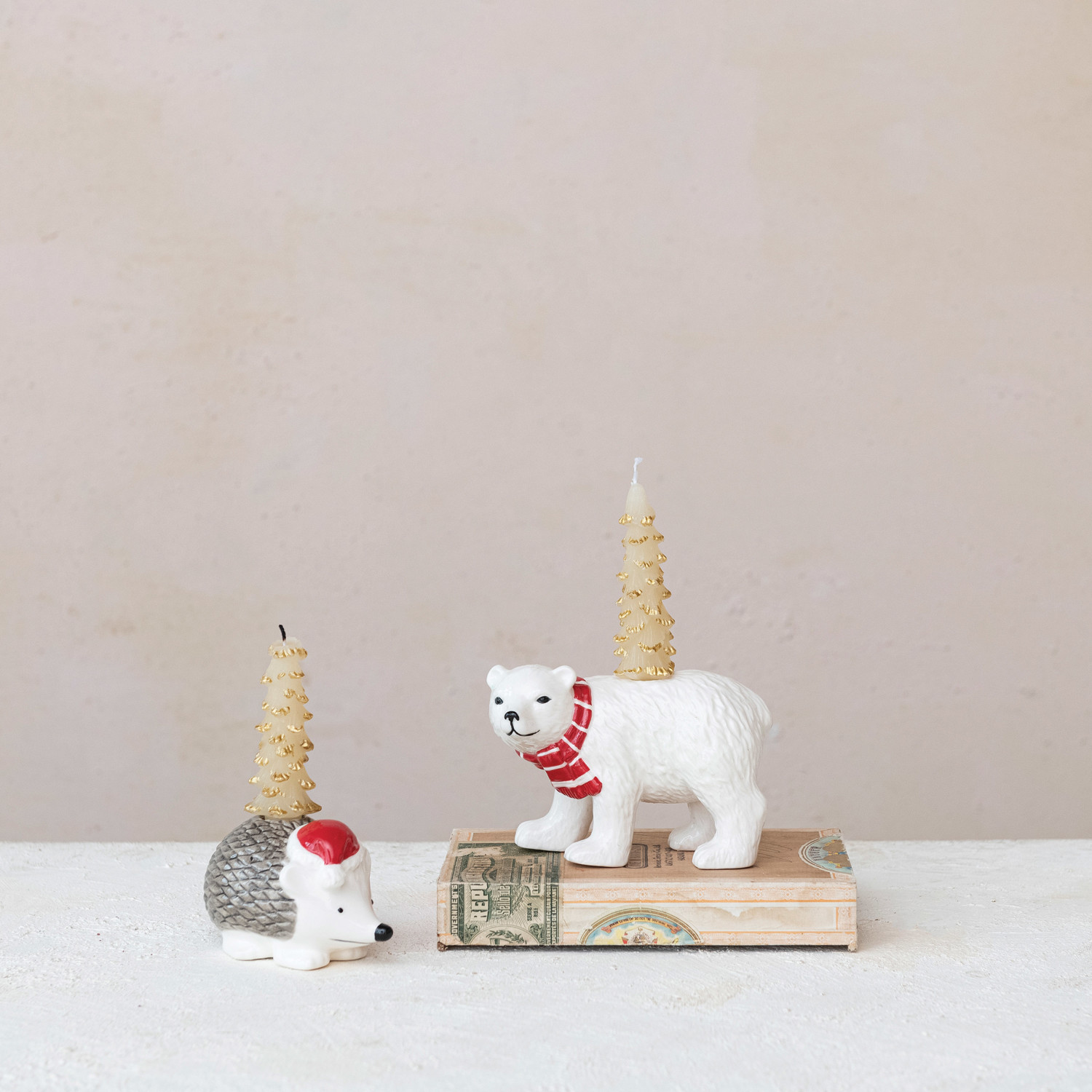 This stoneware polar bear taper candleholder is a heartwarming addition to any holiday decorations. Standing 4.5 inches tall, 6 inches long, and 3 inches wide, it's designed to hold a taper candle and add a festive glow to the home. The white color, along with the charming red scarf, make it a memorable piece that's sure to become a cherished part of every seasonal tradition. The intricate details on the bear's face and fur add a touch of whimsy to the decor, while the sturdy stoneware construction ensures durability for years to come. Whether displayed on a mantel, shelf, or dining table, this candleholder will bring joy and warmth to any holiday gathering. A whimsical stoneware polar bear taper candleholder, complete with a cozy red scarf, in a festive white and red color scheme. An endearing piece that adds a touch of playful charm to the holiday decor. Ideal for adorning mantels or tables, it brings a cheerful light to winter celebrations.
