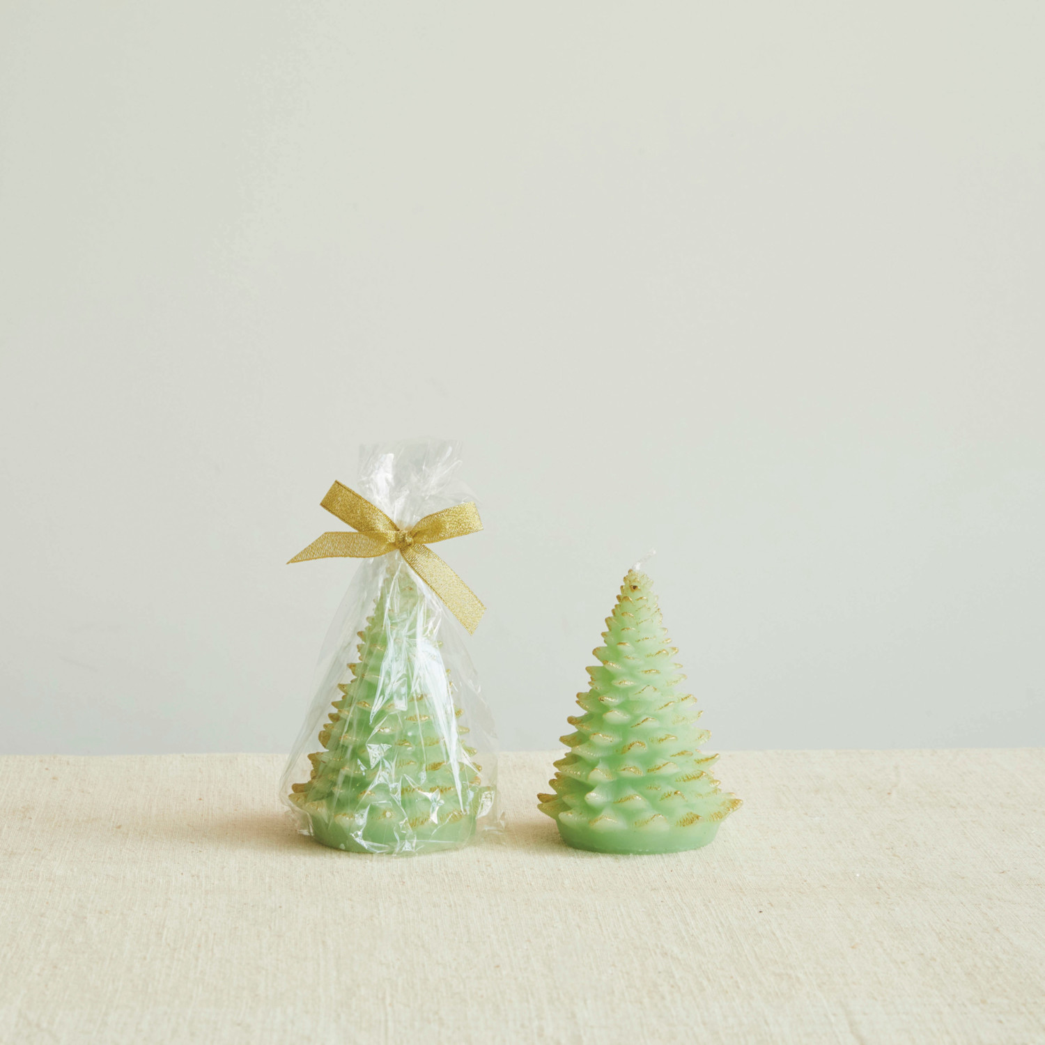 Catalog Name: 3-3/4" Round x 5"H Unscented Tree Shaped Candle w/ Gold Tips, Mint Color (Approximate Burn Time 28 Hours)