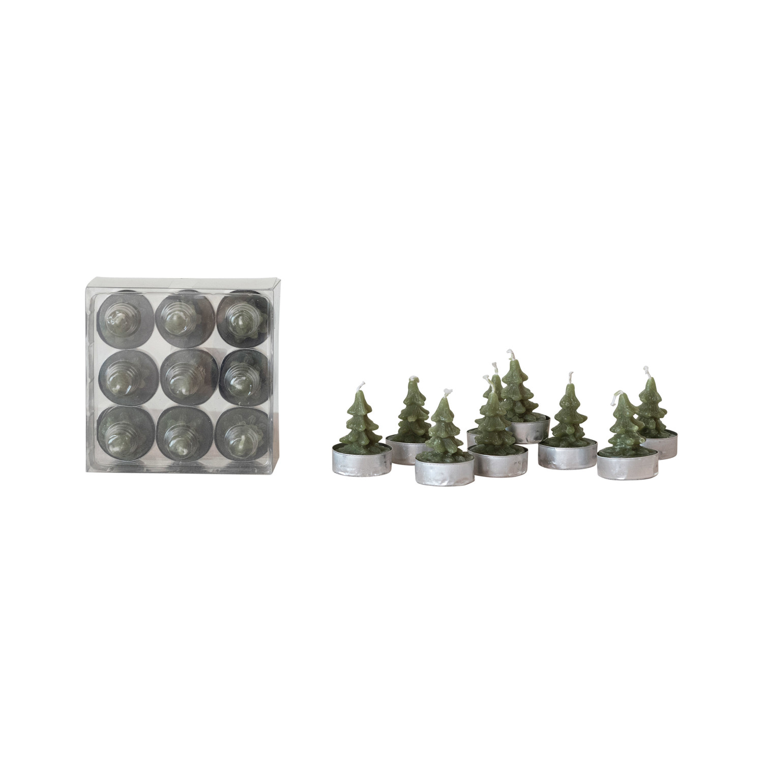 Catalog Name: 1-1/2" Round Unscented Tree Shaped Tealights in Box, Pewter Color, Set of 9 (Approximate Burn Time 3 Hours)