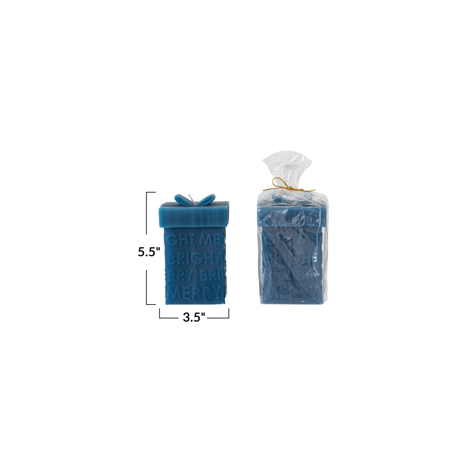 Catalog Name: 3-1/2" Square x 5-1/2"H Unscented Gift Box Shaped Candle "Merry/Bright", Blue (Approximate Burn Time 75 Hours)