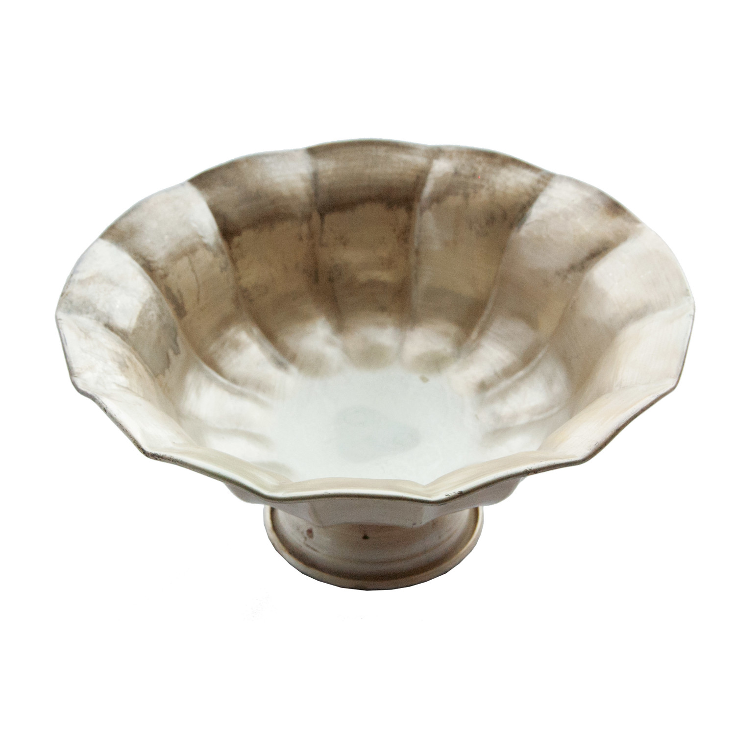 Catalog Name: 9-3/4" Round x 4-1/2"H Decorative Metal Ruffled Footed Bowl, Distressed Gold Finish