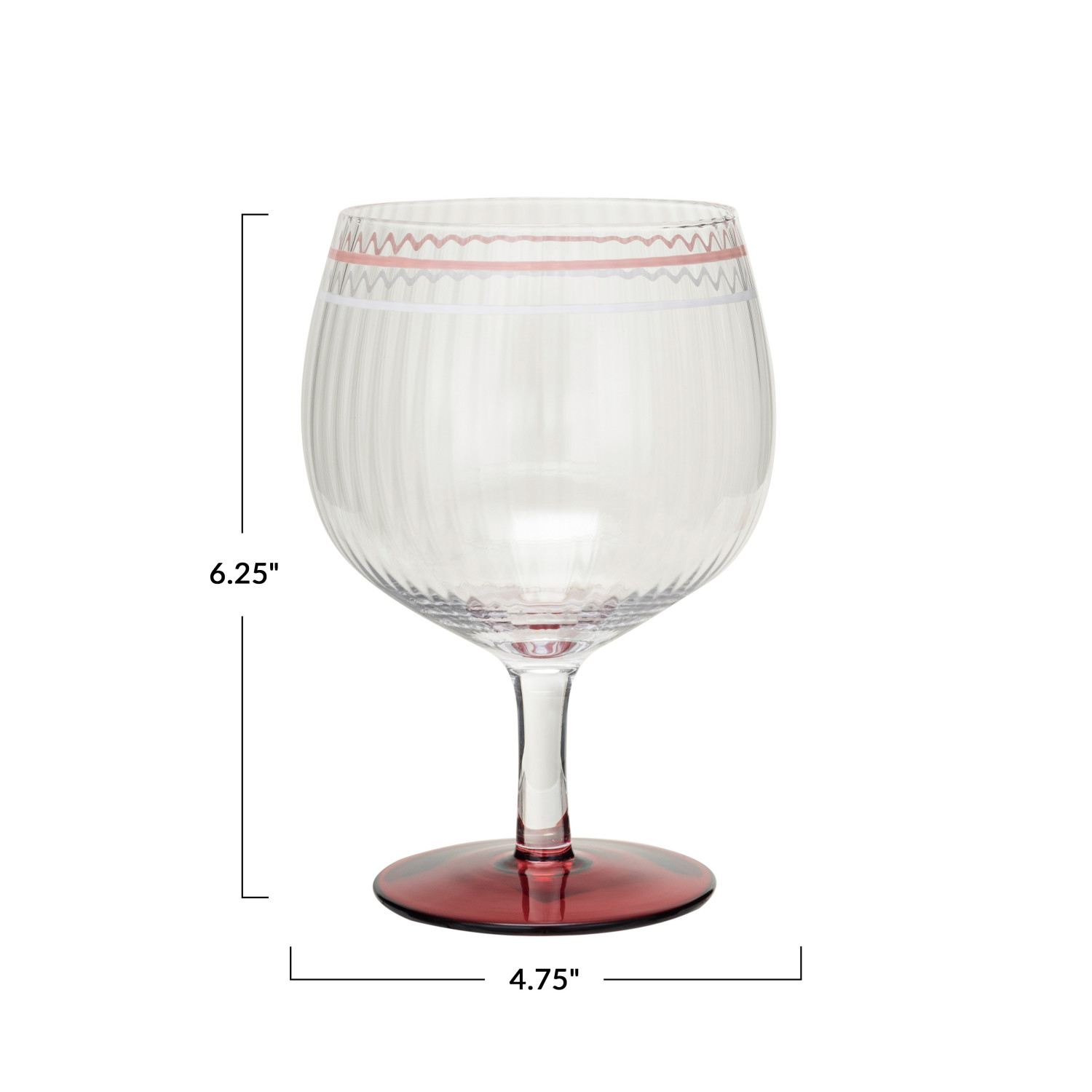 This 20-ounce wine glass is a beautiful homage to vintage design, updated with a contemporary twist. A single hand-painted stripe complements the fluted clear glass for an elegant look, adding a unique touch to each piece. The red base provides a striking contrast, making this glass a standout addition to any wine lover's collection. Whether used for a quiet evening in or a lively dinner party, this wine glass is sure to enhance the experience of savoring preferred wines, both in taste and in presentation. Its ample size is perfect for those who enjoy a robust pour, and the detailed craftsmanship promises to be a topic of conversation among guests. A sip of nostalgia, this stemmed fluted wine glass boasts a hand-painted stripe and a vibrant red base. A timeless piece for the wine aficionado, it's a blend of classic design and a dash of bold modernity. This wine glass not only enhances the flavor profile of wine but also the aesthetics of the table.