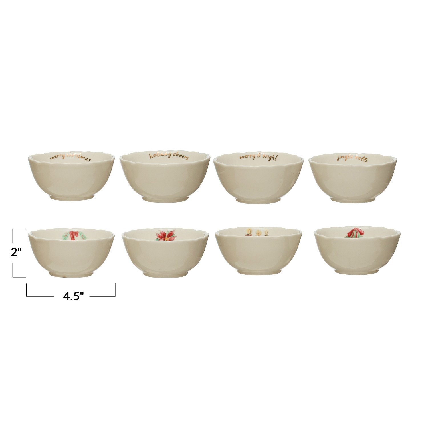 Catalog Name: 4-1/2" Round x 2"H Stoneware Bowl w/ Holiday Greeting/Greenery & Gold Electroplating, Multi Color, 4 Styles ©