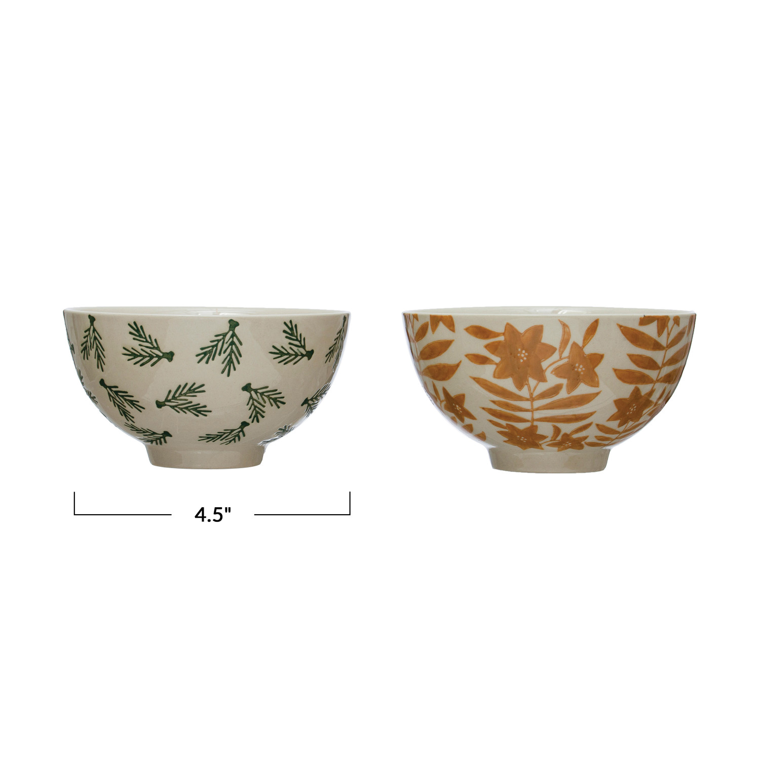 4-1/2" Round Hand-Painted Stoneware Bowl w/ Wax Relief Flowers/Greenery, 2 Styles