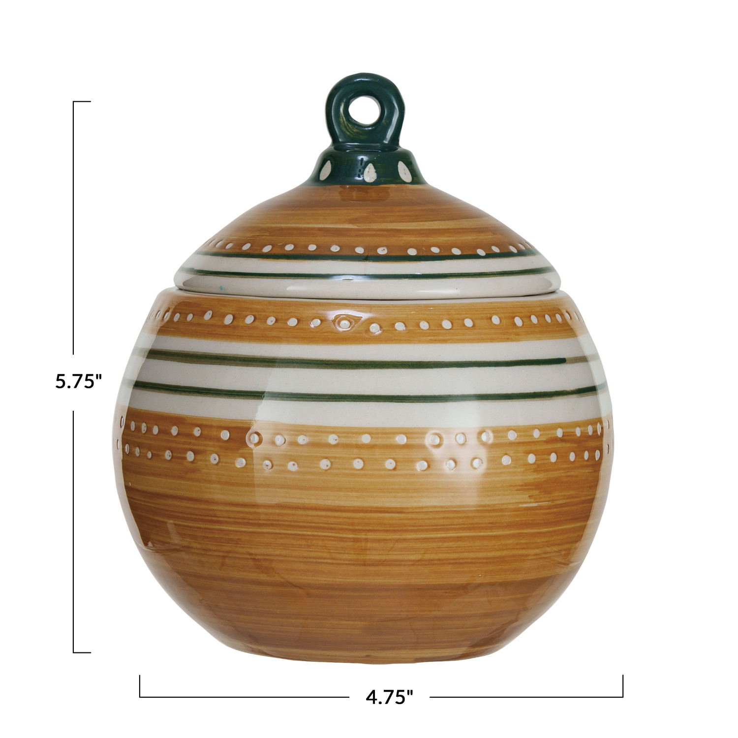 Catalog Name: 4-3/4" Round x 5-3/4"H Hand-Painted Stoneware Ornament Shaped Jar w/ Wax Relief Pattern, Multi Color ©