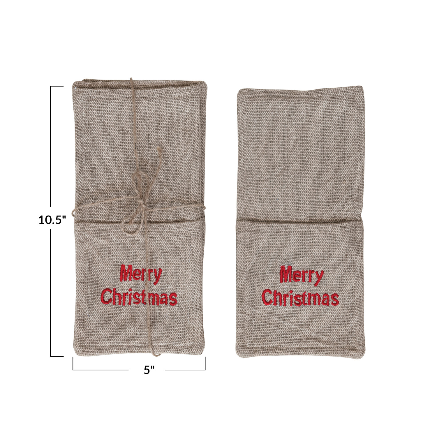 Catalog Name: 10-1/2"L x 5"W Woven Cotton Cutlery Sleeves w/ Embroidery "Merry Christmas", Beige & Red, Set of 4