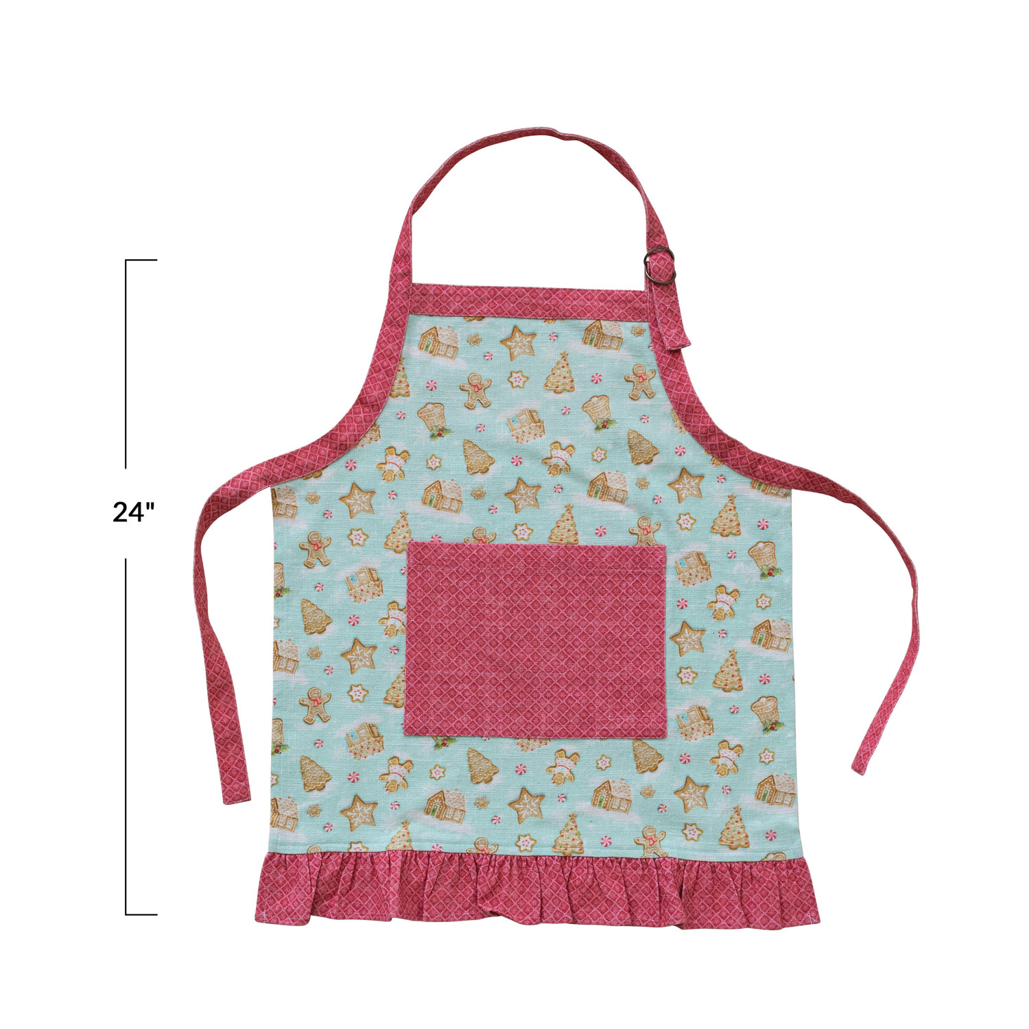 Catalog Name: 24"L x 20"W Cotton Child Apron w/ Gingerbread Man Pattern, Pocket, Ruffle, Chef Hat & Hot Mitt, Multi Color, Set of 3 ©