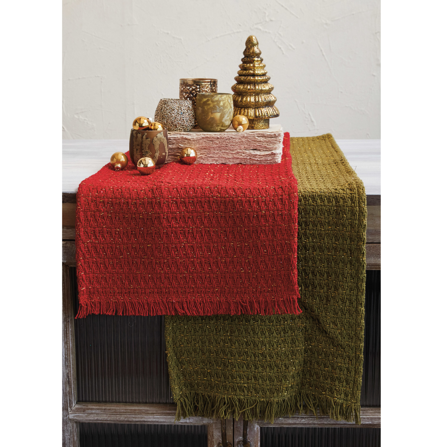 Add some glamour and elegance to the dining table with this woven cotton table runner with metallic gold thread and fringe in green. This table runner is a sophisticated and chic piece that features a green color and a metallic gold thread and fringe that adds some shine and texture to any space. The table runner is suitable for any occasion, whether it is a casual family meal, a festive holiday celebration, or a special event. The table runner is made of a blend of cotton and metallic thread, which makes it soft, smooth, durable, and easy to care for. The table runner measures 108 inches in length and 14 inches in width, making it a great fit for most tables. Transform any tableĀ into a stylish display with thisĀ versatile and functional table runner. A woven cotton table runner with a green color and a metallic gold thread and fringe that adds some shine and texture. A sophisticated and chic piece that can add some glamour and elegance to the dining table. This table runner is suitable for any occasion, whether it is a casual family meal, a festive holiday celebration, or a special event.
