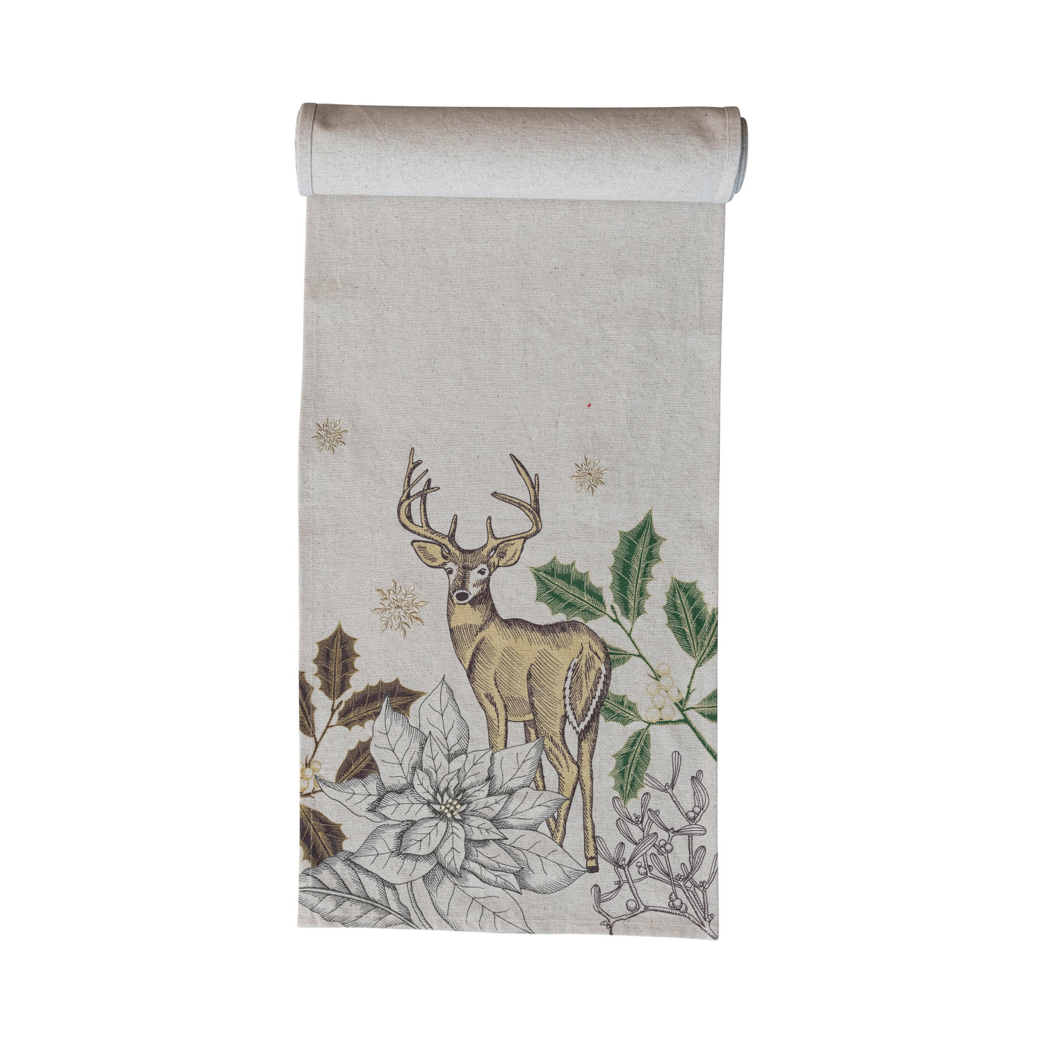 Catalog Name: 108"L x 14"W Cotton & Linen Printed Table Runner w/ Flora/Fauna Pattern & Metallic Gold Thread Embroidery, Green & Natural ©