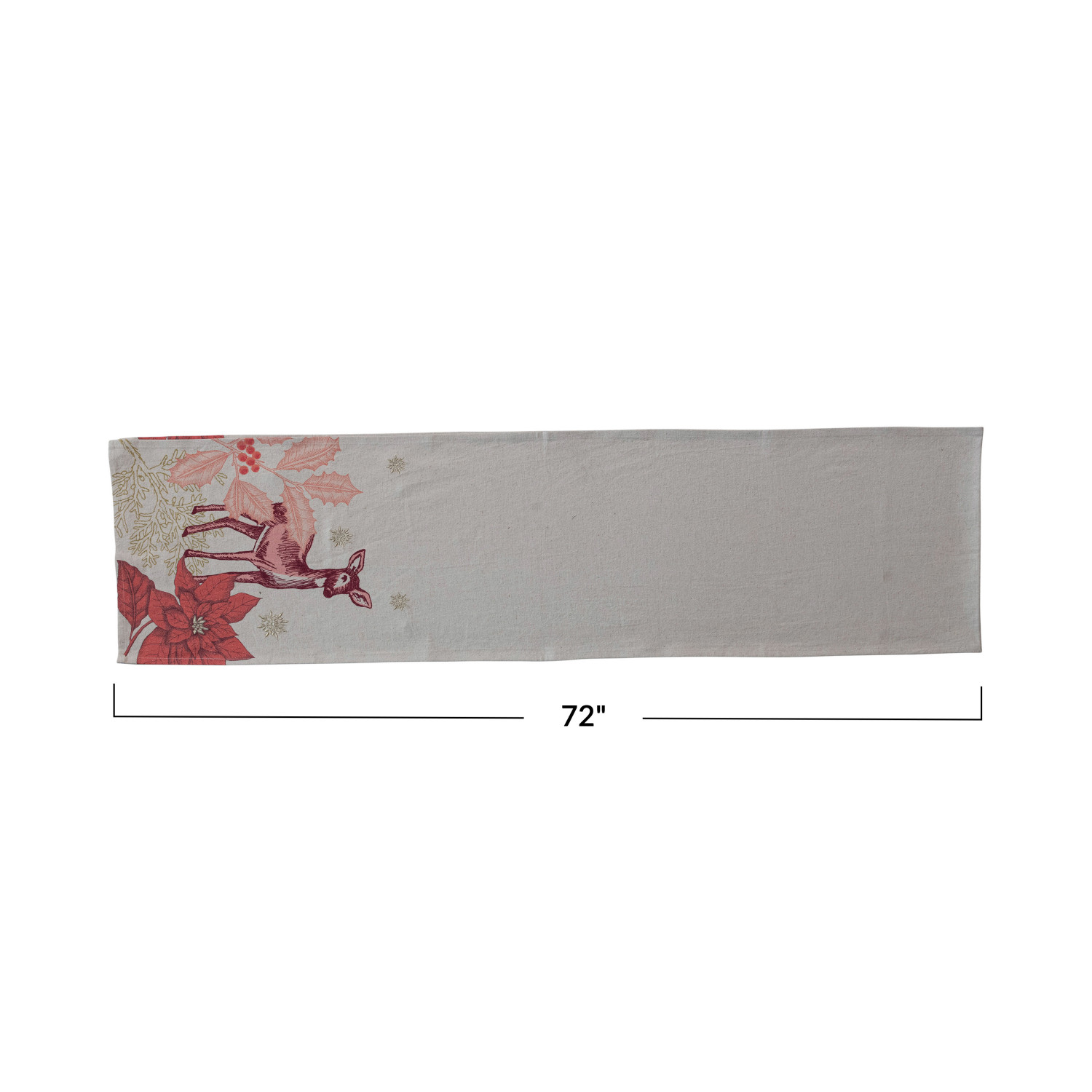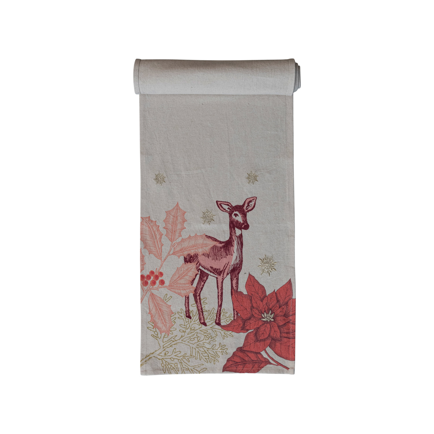 Catalog Name: 108"L x 14"W Cotton & Linen Printed Table Runner w/ Flora/Fauna Pattern & Metallic Gold Thread Embroidery, Berry Color & Natural ©