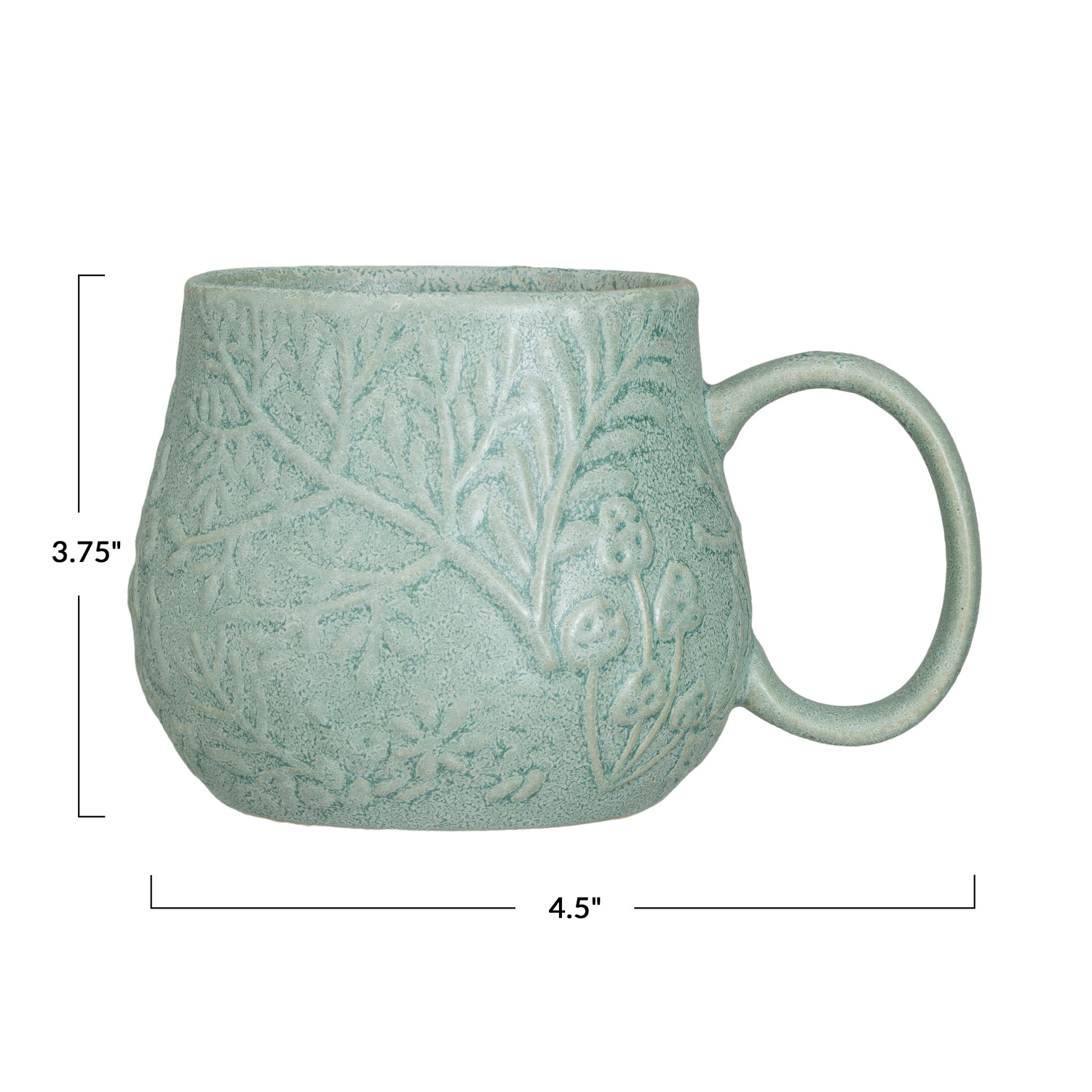 Catalog Name: 4-1/2" Round x 3-3/4"H 16 oz. Embossed Stoneware Mug w/ Botanicals, Reactive Glaze, Sage Color (Each One Will Vary)