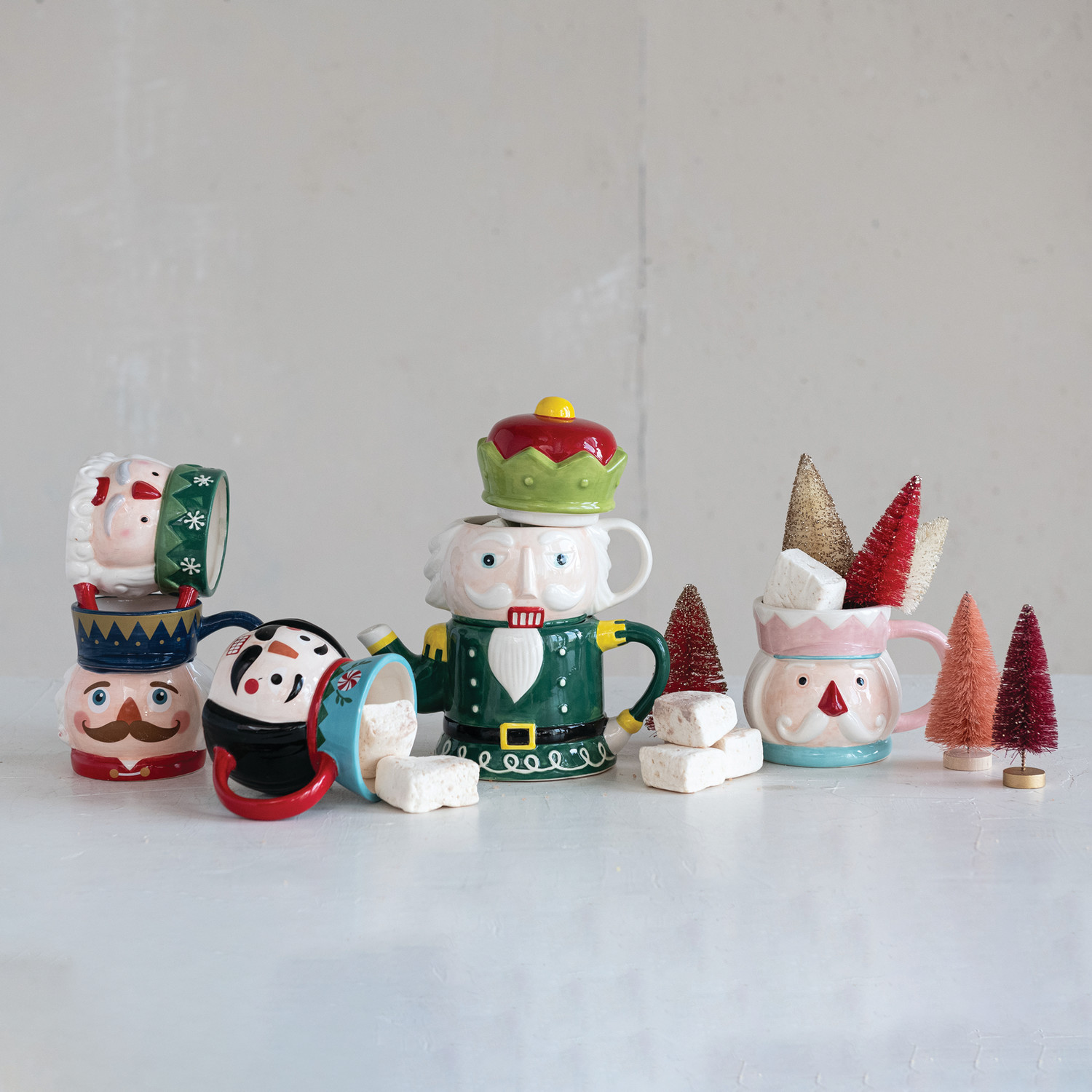 Catalog Name: 5" Round x 3-1/2"H 12 oz. Hand-Painted Ceramic Nutcracker Head Shaped Mug, Reactive Glaze, Multi Color, 4 Styles (Each One Will Vary)