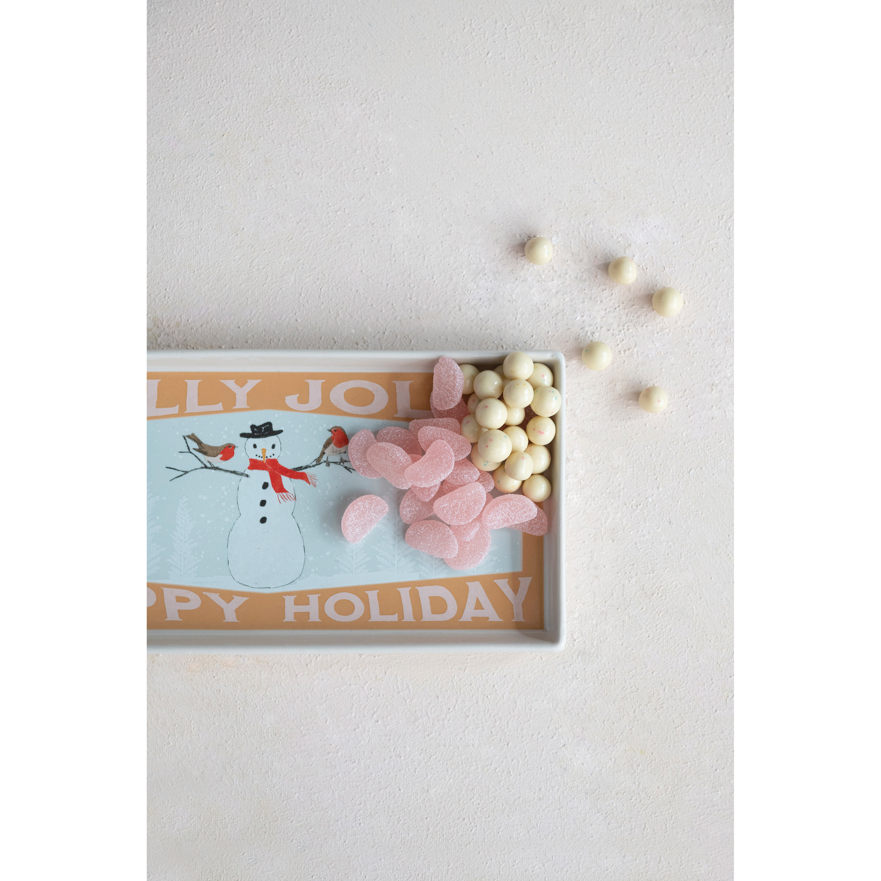 Catalog Name: 12-3/4"L x 6-1/2"W Stoneware Tray with Snowman "Holly Jolly Happy Holiday", Multi Color