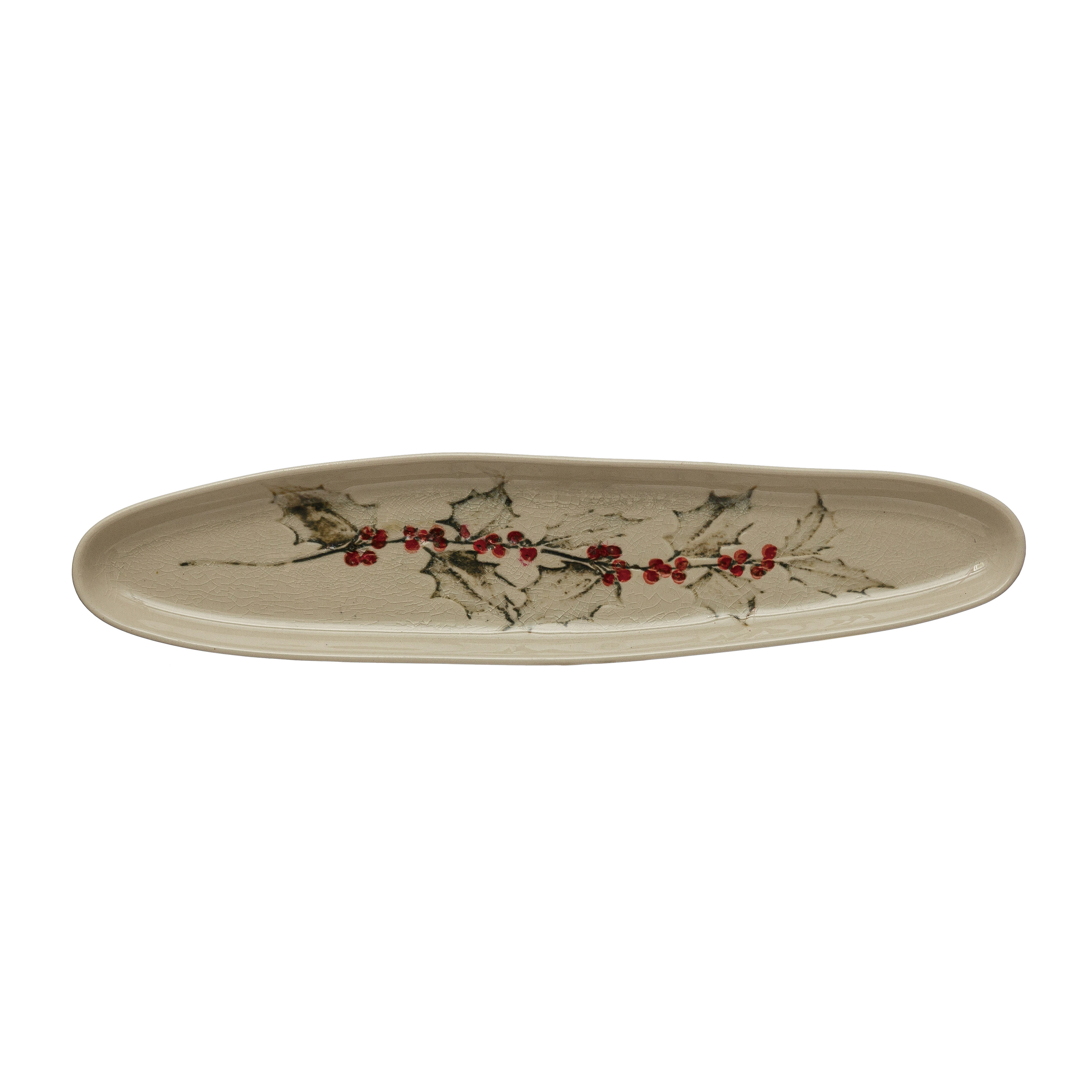 Oval Debossed Stoneware Tray with Holly, Reactive Crackle Glaze