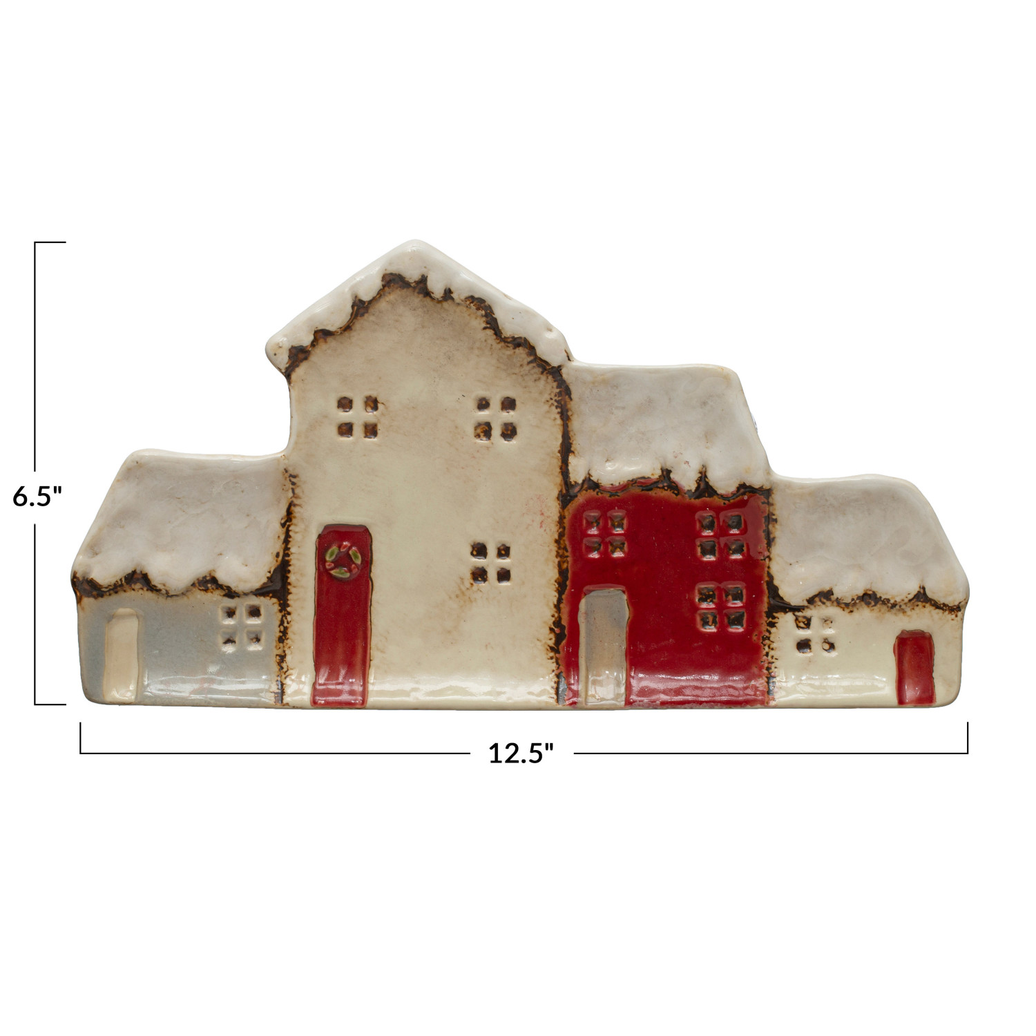 Catalog Name: 12-1/2"L x 6-1/2"W Hand-Painted Stoneware Houses Platter, Reactive Glaze, Multi Color (Each One Will Vary)
