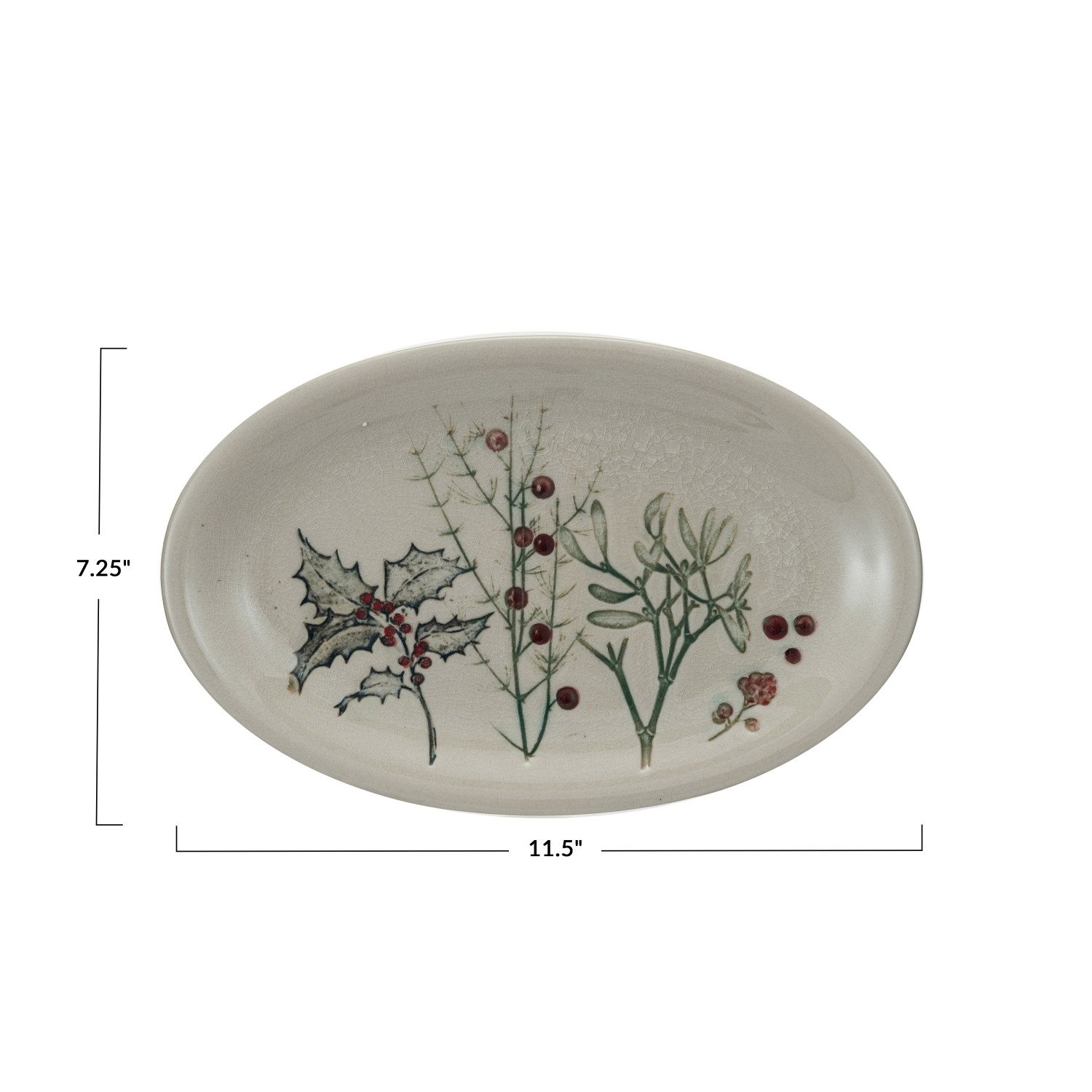 This stoneware platter, with its intricate debossed design of seasonal botanicals and a distinctive reactive crackle glaze, brings a touch of artisanal beauty to any table setting. Each platter boasts a unique multi-colored pattern, ensuring that no two are exactly alike. The food-safe material makes it ideal for serving a variety of dishes, while its measurements of 11.5 inches in length and 7.25 inches in width make it a practical choice for both intimate dinners and larger gatherings. Whether used to display hors d'oeuvres, main courses, or as a decorative piece, this platter is sure to impress with its blend of elegance and craftsmanship. A beautifully debossed stoneware platter with seasonal botanicals and a reactive crackle glaze, offering a unique multi-colored design. A versatile piece that can serve as a stunning backdrop for any culinary creations or as an elegant decorative accent. This platter is perfect for presenting festive dishes or as a centerpiece to elevate the dining decor.