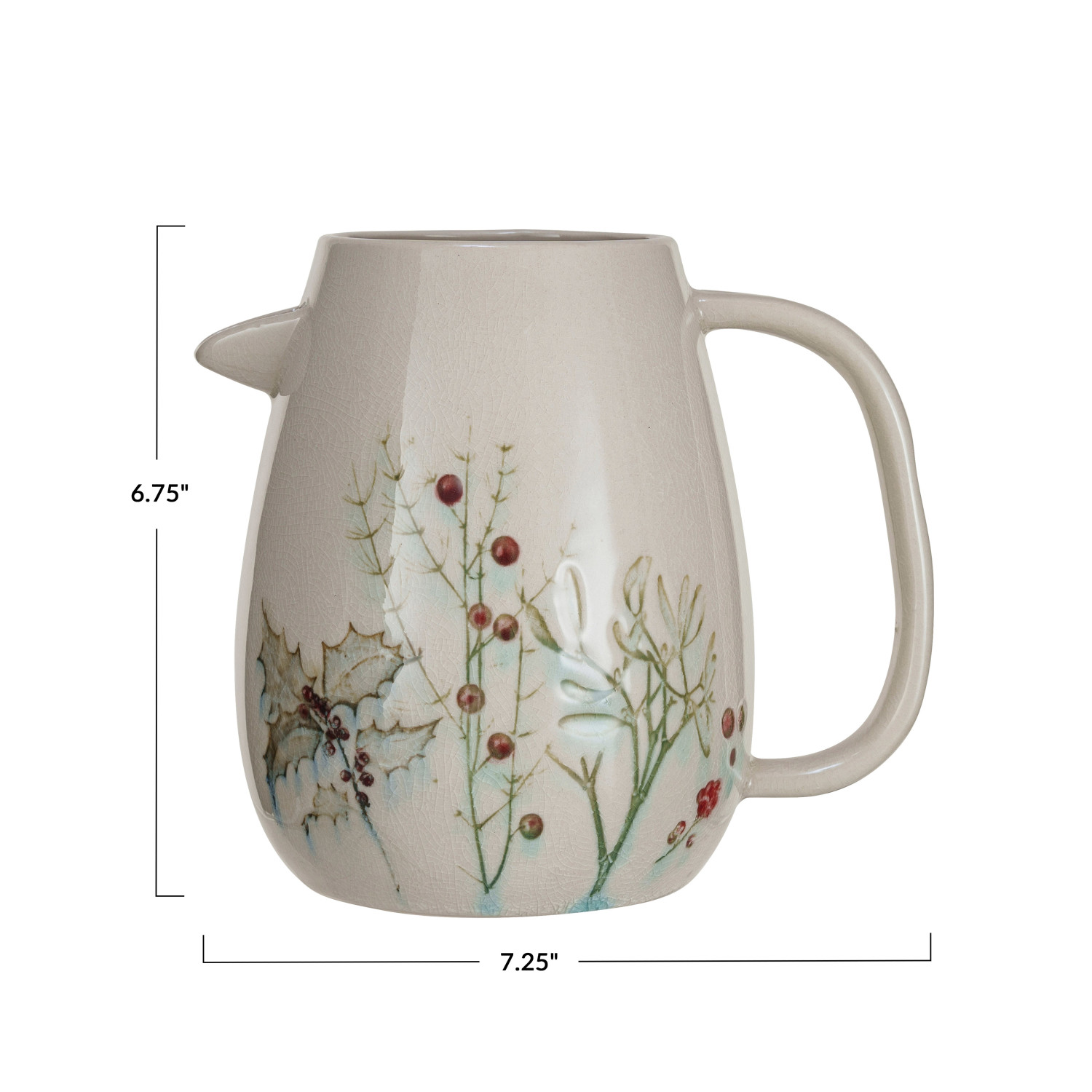 This exquisite stoneware pitcher, boasting a vibrant array of colors and debossed with seasonal botanicals, is finished with a unique reactive crackle glaze, making each piece a one-of-a-kind treasure. The food-safe design allows for a variety of uses, from serving any favorite drink to being a charming vessel for floral arrangements. Measuring 7.25 inches in length, 5 inches in width, and 6.75 inches in height, it holds up to 50 ounces, making it both a practical and stylish choice for any occasion. The handcrafted nature of this pitcher, coupled with its captivating design, ensures it will be a beloved addition to the collection or a thoughtful gift for someone special. Whether used daily or on special occasions, it's sure to impress and serve beautifully. A multi-colored stoneware pitcher adorned with debossed seasonal botanicals and a reactive crackle glaze; each piece uniquely crafted. A versatile showpiece that can serve as a functional pitcher or a standalone decorative element in any kitchen or dining area. This pitcher is perfect for serving beverages or displaying fresh flowers, enhancing the beauty of home with each use.