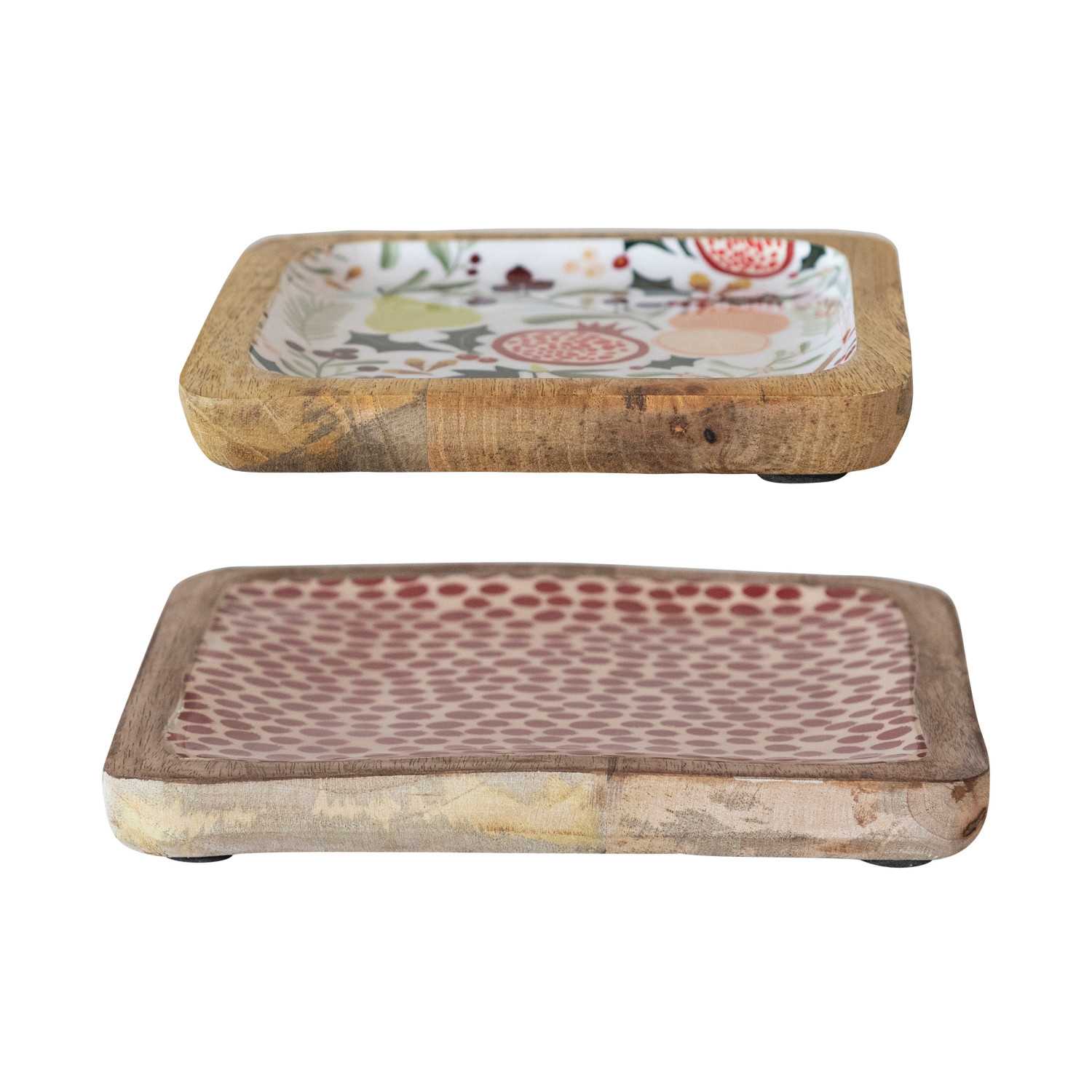 Catalog Name: 8" Square & 6-1/4" Square Enameled Mango Wood Trays w/ Fruit/Botanicals & Dots Pattern, Multi Color, Set of 2 ©