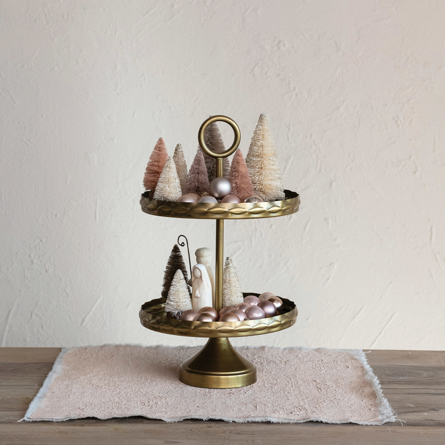 This decorative metal two-tier tray is a stunning addition to any table setting. With its round shape, embossed edges, and brass electroplating, it exudes a classic elegance. The tray is designed to be knocked down for easy storage and transport. It's also food safe, ensuring that it's not only beautiful but also practical for serving and entertaining guests. Whether used for high tea or as a part of every home decor, this tray is sure to impress. It measures 10.5 inches in diameter and 17 inches in height, making it ideal for a variety of display options. The intricate design and durable construction make this tray a versatile piece that can be used for serving appetizers, desserts, or even as a centerpiece. The timeless appeal of the brass finish adds a touch of sophistication to any occasion. A luxurious centerpiece, this two-tier tray features an embossed edge and gleaming brass electroplating. An opulent touch for any celebration, it's perfect for displaying hors d'oeuvres or sweet treats with style. This tray stands tall as a decorative statement or as a practical serving piece for any event.