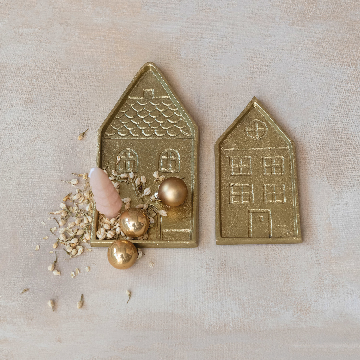 Debossed Cast Aluminum House Shaped Trays, Gold Finish, Set of 2
