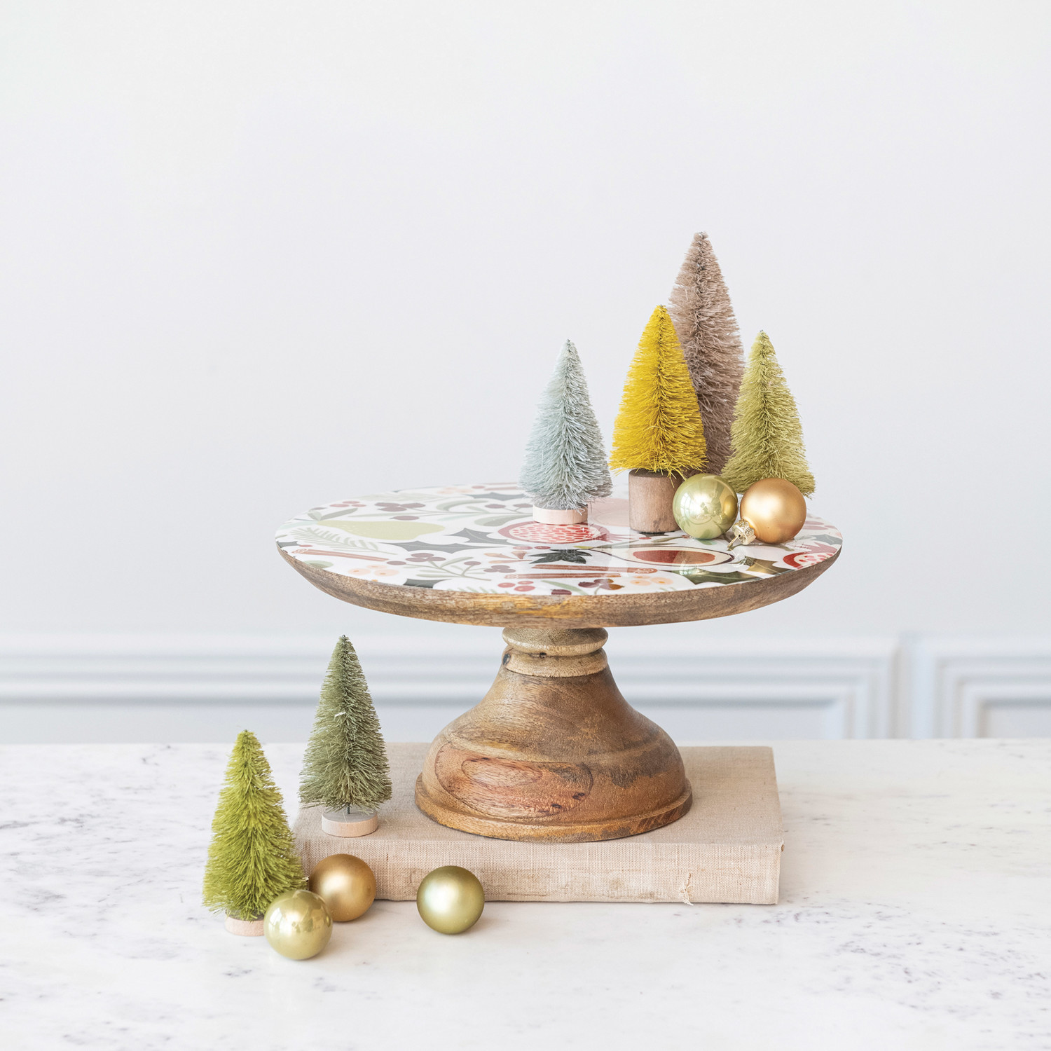 This enameled mango wood pedestal, measuring 11.75 inches in diameter and 5.75 inches high, is a celebration of craftsmanship and design. Adorned with a lush fruit and botanical pattern, its vivid colors bring a burst of life to any table or countertop. The food-safe enamel finish makes it perfect for serving, while the hand-washable care ensures long-lasting beauty. Whether used for special occasions or everyday enjoyment, this pedestal will elevate the dishes to new heights of elegance. Each piece is unique, with slight variations that add to its charm. The pedestal's sturdy construction and timeless style make it a versatile addition to any home decor. Its intricate detailing and vibrant colors make it a stunning centerpiece for any gathering. A vibrant enameled mango wood pedestal graced with a colorful fruit and botanicals pattern, perfect for any lively setting. An eye-catching display piece, this pedestal effortlessly combines functionality with a flair for the dramatic. This pedestal is food safe, ideal for showcasing a decadent cake or an array of hors d'oeuvres at the next gathering.