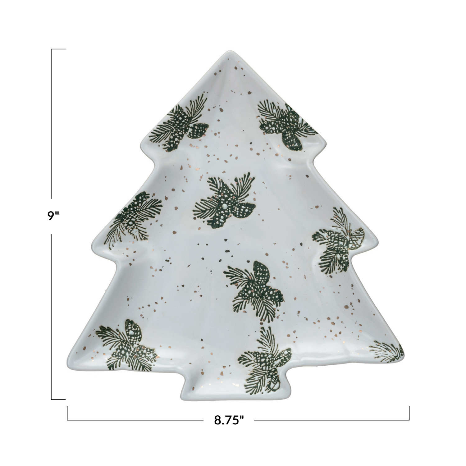 This tree-shaped stoneware plate, measuring 9 inches in length and 8.75 inches in width, is a beautiful addition to the holiday serveware. The white plate features a wax relief design of pinecones and pine boughs, highlighted with exquisite gold electroplating for a touch of elegance. Its food-safe quality makes it ideal for presenting favorite Christmas cookies or as a stunning centerpiece. The hand-wash recommendation ensures the longevity of the gold detailing, making this plate a timeless treasure for the festive occasions. Each plate is unique, with slight variations that add to its charm and character. A festive stoneware tree-shaped plate adorned with wax relief pinecones and pine boughs, accented with gold electroplating. An exquisite piece for seasonal celebrations, this plate's intricate details and gold touches add a luxurious feel to the holiday decor. This plate is food safe, perfect for serving holiday confections or as an elegant decorative element on the Christmas table.