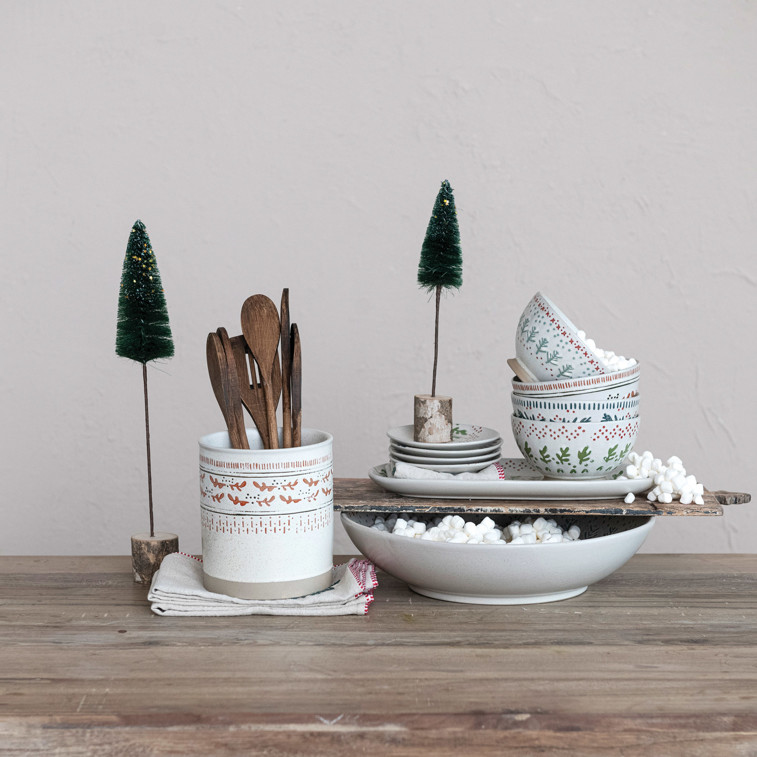 Catalog Name: 13-3/4" Round x 3"H Hand-Stamped Stoneware Serving Bowl w/ Wax Relief Tree Pattern, Multi Color