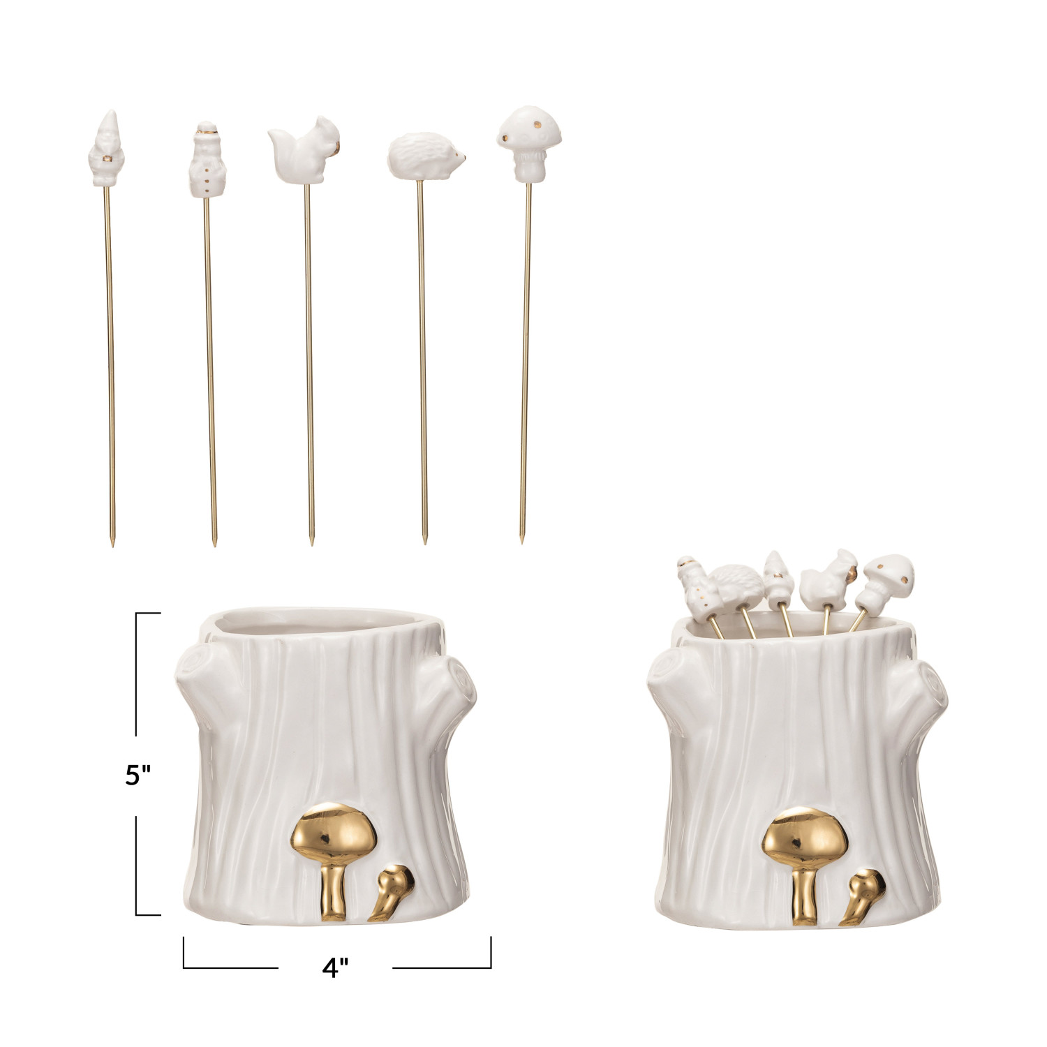 Catalog Name: 4" Round x 5"H Ceramic & Stainless Steel Forest Icon Appetizer Picks w/ Ceramic Stump Shaped Holder & Gold Electroplating, White, Set of 6 ©