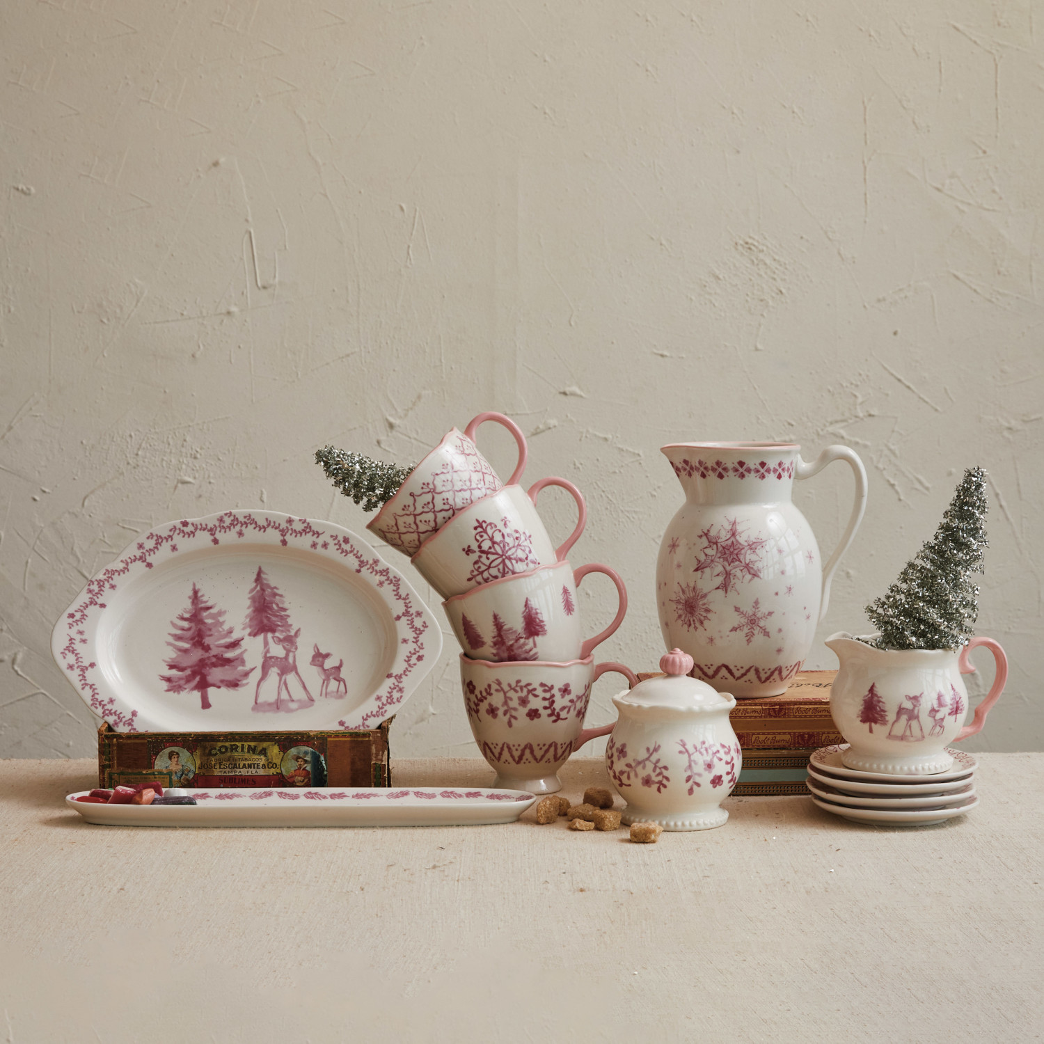 Catalog Name: 12"L x 8-1/4"W Stoneware Platter w/ Deer & Trees, Pink & Cream Color