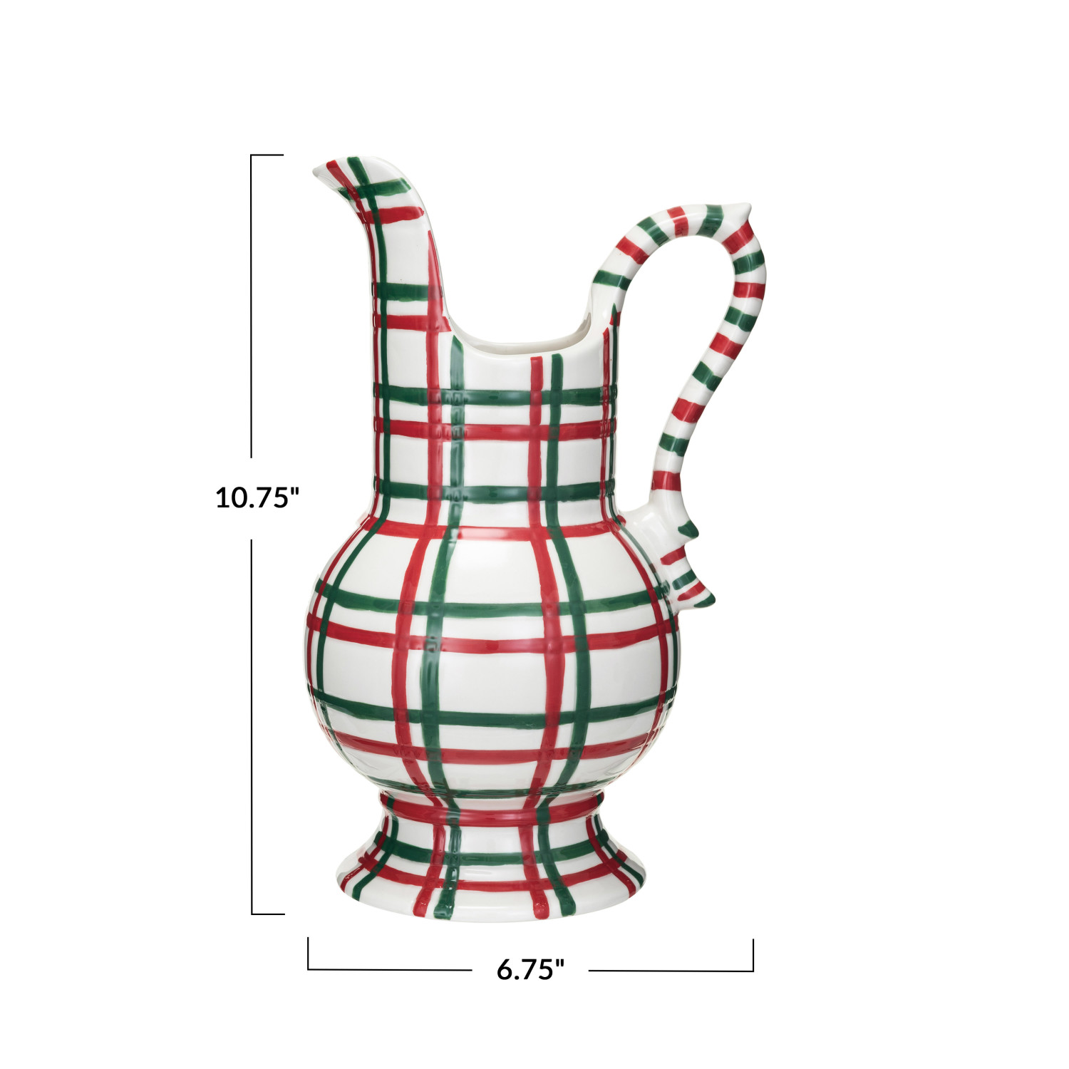This beautifully hand-painted stoneware pitcher, adorned with a classic red, green, and white plaid pattern, captures the essence of the holiday season. The generous size of 6.75 inches in length, 5.5 inches in width, and 10.75 inches in height, along with a 2-quart capacity, makes it a versatile piece for serving drinks or displaying festive florals. The food-safe quality ensures it's ready for use at next holiday feast, and the hand-wash recommendation will keep it looking splendid year after year. Whether filled with a warming spiced cider or holding a spray of evergreen, this pitcher is sure to become a cherished part of every holiday tradition. A hand-painted stoneware pitcher in a festive red, green, and white plaid, perfect for holiday gatherings. A classic piece that brings a touch of timeless holiday charm to any table setting. This pitcher is ideal for serving seasonal beverages or as a decorative vase for a holiday bouquet.