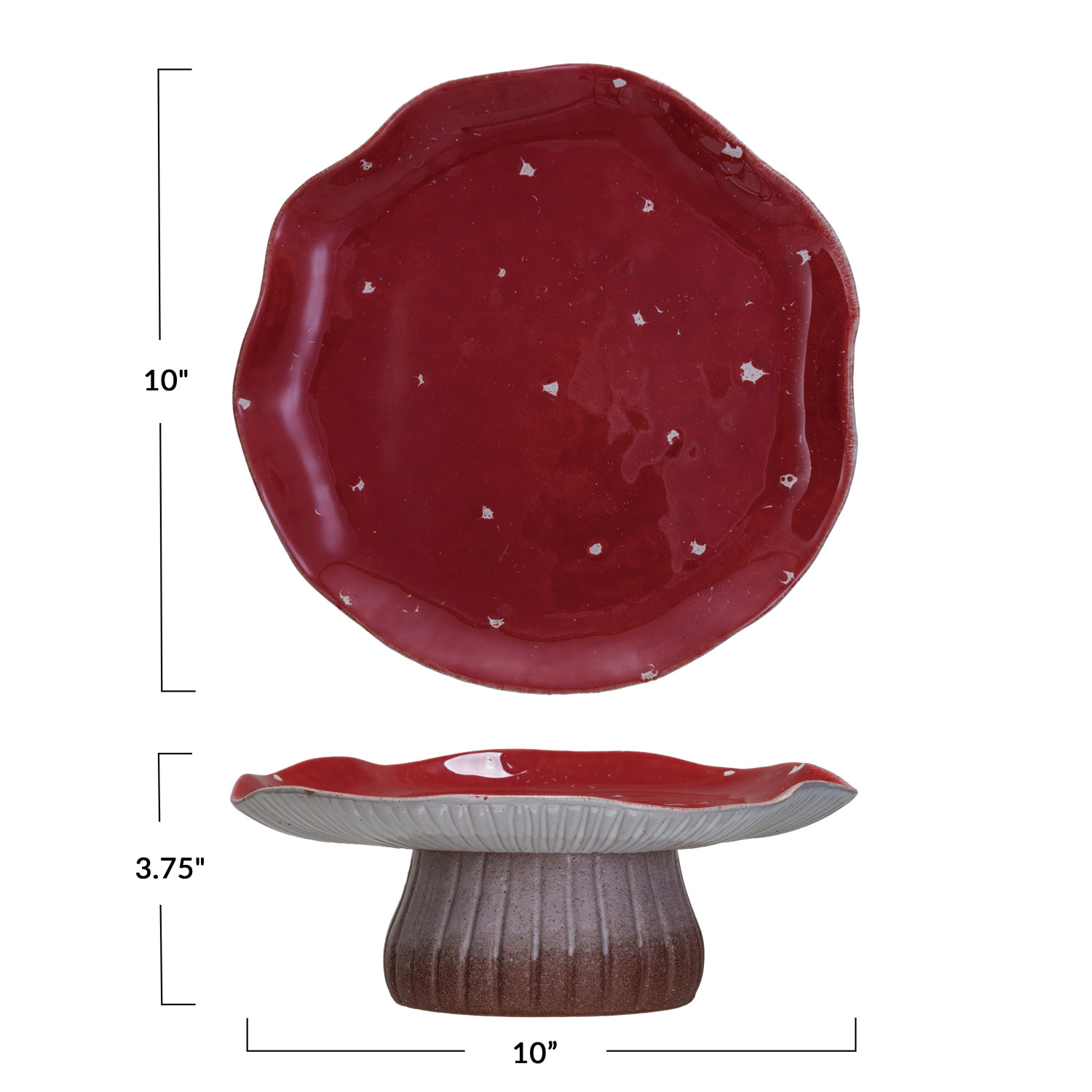 This enchanted pedestal is a delightful piece that captures the imagination with its mushroom shape and a reactive glaze that creates a one-of-a-kind pattern in red, white, and brown. Standing at 10 inches round and 3.75 inches high, it's a food-safe platform that's as functional as it is decorative. Each pedestal varies slightly, adding to its charm and making it a unique addition to the home. Whether used for serving or as a decorative element, it's sure to enchant and inspire whimsy in any space. It's a delightful piece that will surely be a conversation starter at any gathering. A whimsical stoneware pedestal shaped like a mushroom, with a reactive glaze in earthy red, white, and brown. An enchanting addition to any setting, this piece brings a touch of woodland fantasy to the decor. This pedestal is perfect for showcasing favorite treats or as a charming centerpiece.