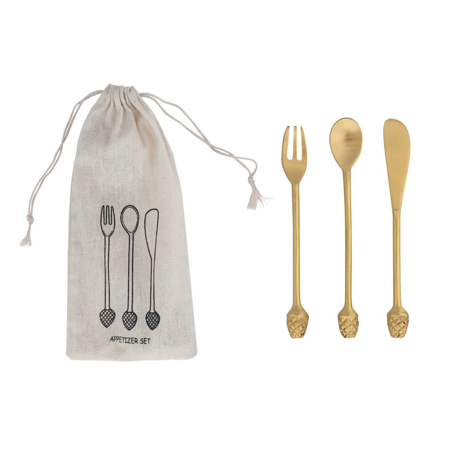 Catalog Name: 6"L Brass Appetizer Set w/ Pinecone Handle, Set of 3 in Printed Drawstring Bag
