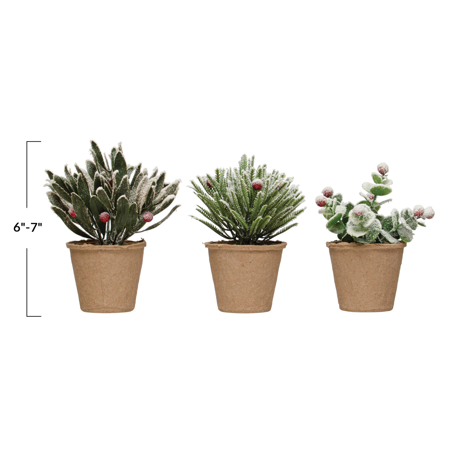 Catalog Name: 6"H - 7"H Faux Greens w/ Red Berries in Paper Mache Pot, Snow Finish & Green, 3 Styles