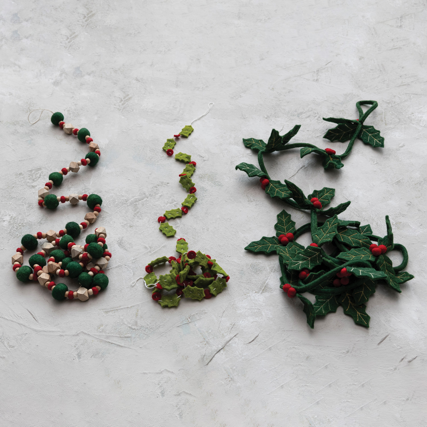 This whimsical garland features delicately handcrafted wool felt holly leaves and berries finished with gold embroidery. Add a touch of festive whimsy to any space with our enchanting collection of garlands, including stunning glass, sleek metal, and delightfully plush options, all expertly crafted to create a merry and bright atmosphere.