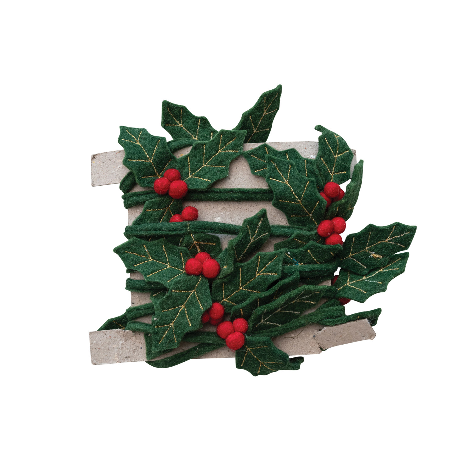 Catalog Name: 72"L Handmade Wool Felt Holly Leaves & Berries Wired Garland w/ Gold Embroidery, Green & Red