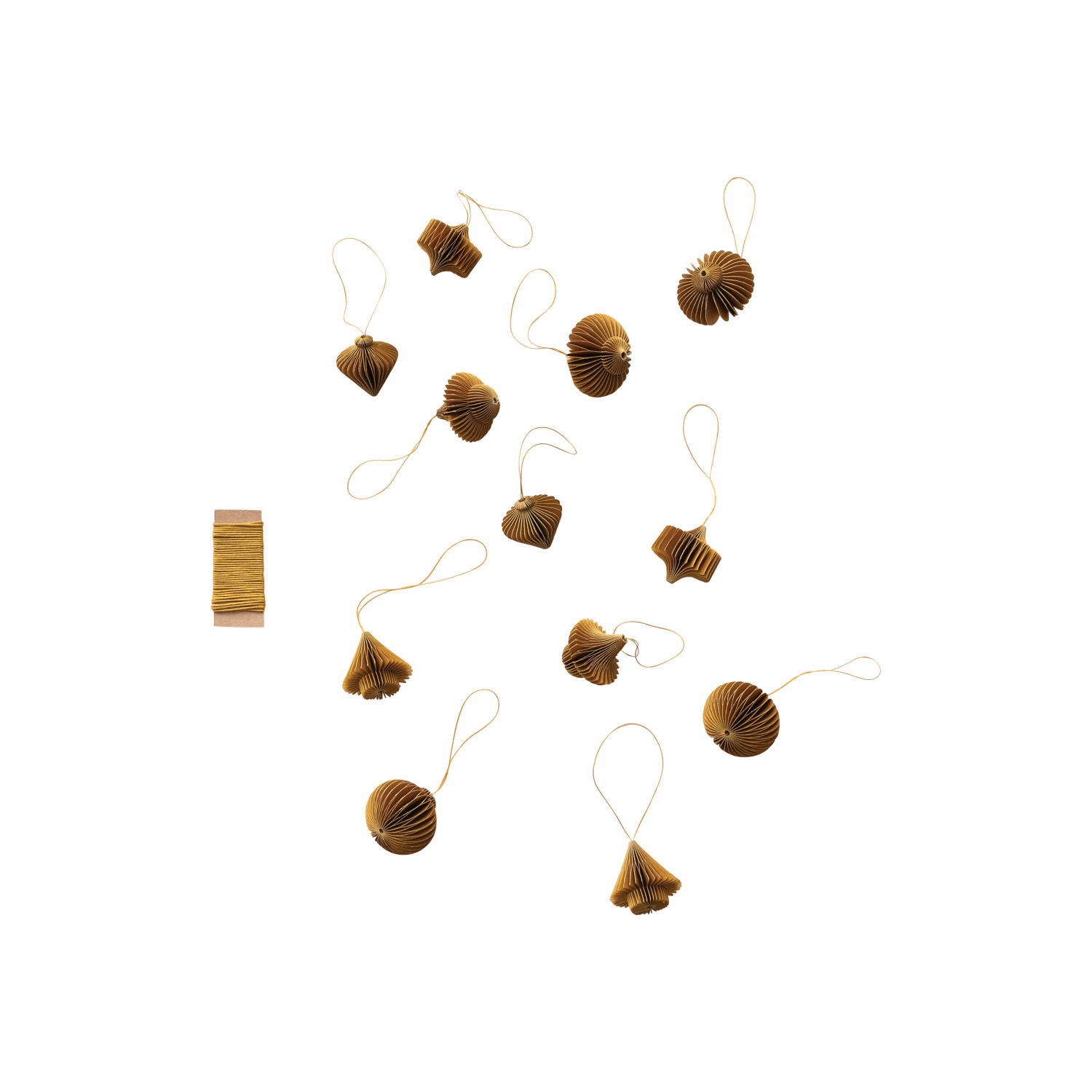 Catalog Name: 1-1/2"H Recycled Paper Folding Honeycomb Ornaments w/ 90"L DIY Garland String, Mustard Color, Boxed Set of 13