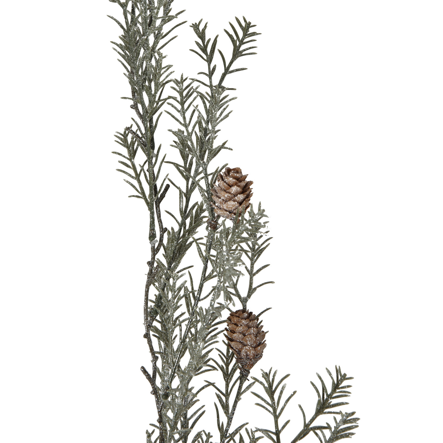 This faux pine spray captures the essence of a winter forest with its frosted finish and interspersed pinecones. At 43.25 inches long and 7.75 inches high, it's a substantial piece that can be used to enhance a variety of settings. The green polyethylene needles are designed to mimic the look and feel of real pine, while the pinecones add a touch of authenticity. Whether used as part of a larger display or on its own, this faux pine spray is a beautiful, maintenance-free way to bring the outdoors into any and every home during the holiday season. This faux pine spray is sure to impress all who see it. A wintry faux pine spray adorned with natural pinecones and a delicate frost finish, bringing a touch of serene greenery indoors. An elegant complement to any winter decor, this spray is perfect for creating a festive yet sophisticated atmosphere. Ideal for draping over mantels, weaving through banisters, or accenting a holiday table, it adds a natural and frost-kissed look.