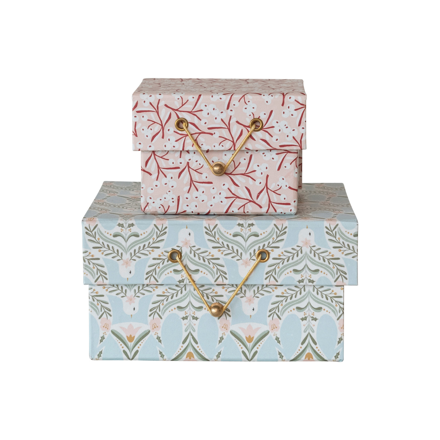 This set of two printed paper gift boxes is a charming way to wrap presents, with each box adorned with a lovely berry and dove pattern. The vibrant colors and intricate designs are complemented by the elegant brass closures, adding a sophisticated touch. The larger box measures 7 inches in length, 6.5 inches in width, and 3.5 inches in height, while the smaller box is a perfect cube at 4 inches, providing ample space for a variety of gifts. Whether for a special occasion or just to show love and care, these gift boxes are sure to make every present stand out. With their sturdy construction and delightful design, they're a gift in and of themselves. A delightful set of two paper gift boxes, each featuring a festive berry and dove pattern, perfect for any gifting occasion. An exquisite choice for presenting thoughtful gifts, these boxes add a touch of elegance with their multicolor patterns and brass closures. Ideal for housing jewelry, trinkets, or small treasures, these boxes are as functional as they are beautiful.