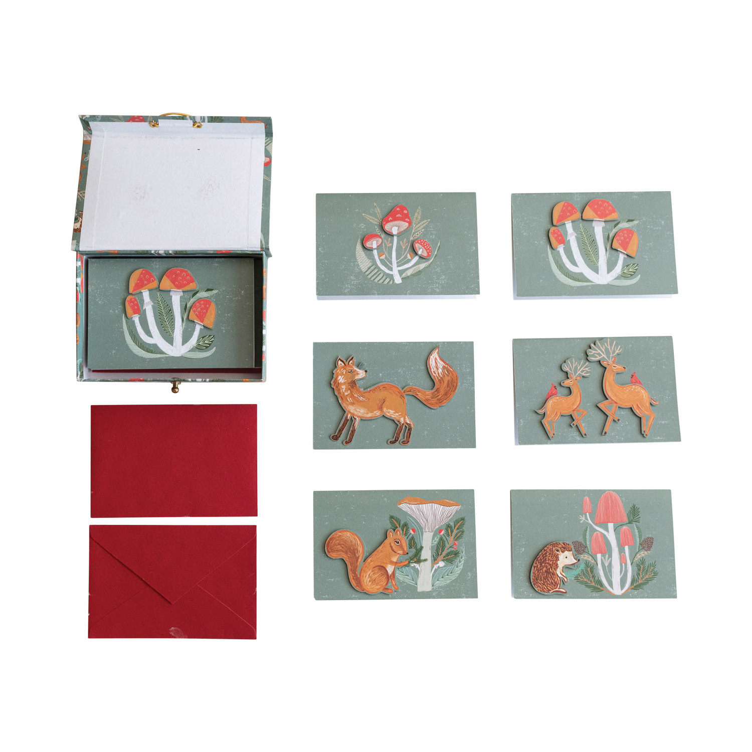 Catalog Name: 7"L x 4-3/4"W Printed Paper Diecut Christmas Cards w/ Woodland Flora/Fauna, Applique & Red Envelopes, Multi Color, 6 Styles, Boxed Set of 6 (Blank Inside) ©