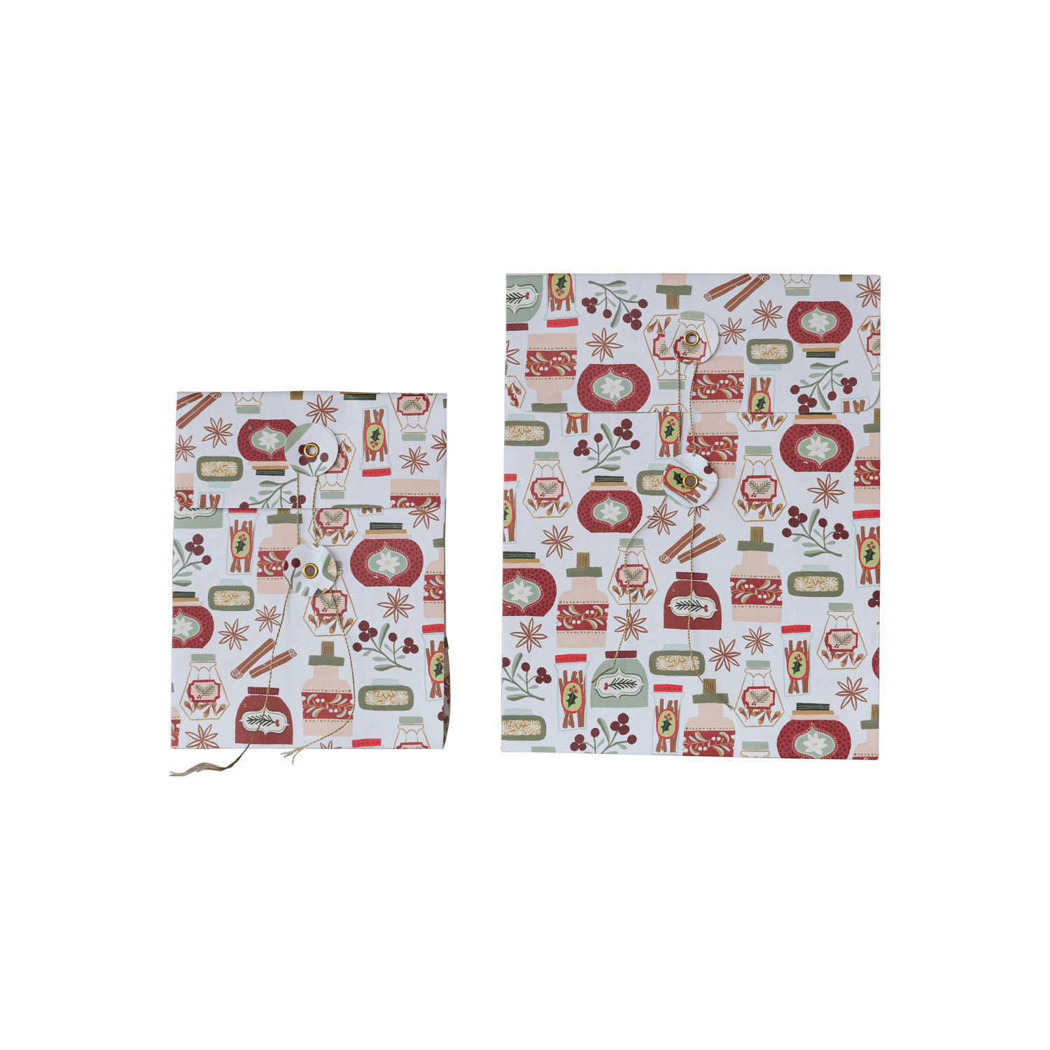 This set of 2 printed paper gift bags is the perfect wrapping solution for the holiday season. The multi-colored patterns adorned with brass accents give these bags a touch of sophistication, while the brass handles ensure durability and easy carrying. The larger bag measures 9 inches in length, 4 inches in width, and 11.5 inches in height, and the smaller one is 6.5 inches long, 3.5 inches wide, and 8.5 inches high, making them ideal for gifts of different sizes. Whether it's for a secret Santa, a thoughtful gift for a loved one, or a token of appreciation for a colleague, these bags will make every present stand out under the Christmas tree. A duo of paper gift bags, each boasting a vibrant holiday pattern and brass detailing, ready to spread festive cheer. An excellent choice for seasonal gifting, these bags elevate presents with their joyful designs and elegant brass handles. Ideal for wrapping holiday gifts, these bags are versatile for Christmas exchanges, office parties, or family gatherings.